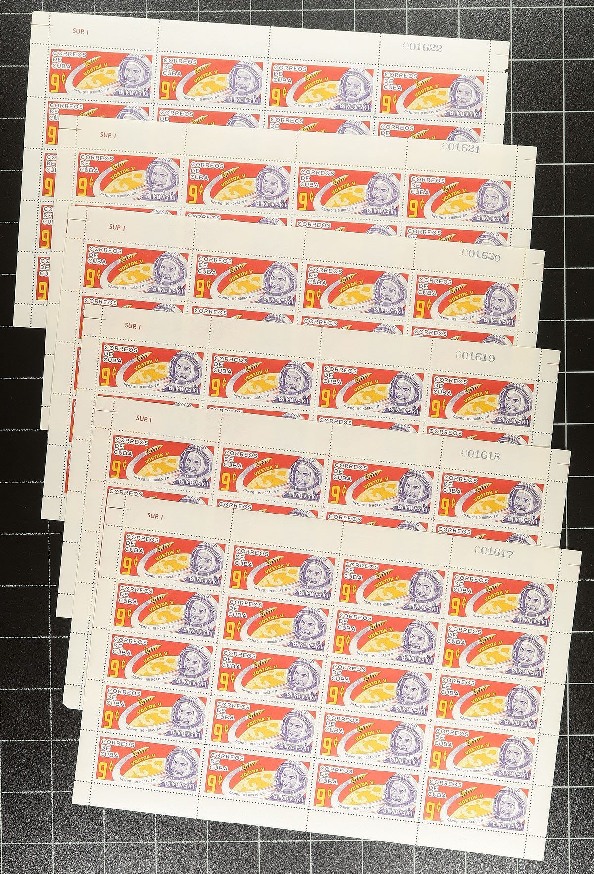 Complete Soviet space flight series of five different denominations depicting high profile cosmonauts, issued 1963-1964 in complete sheets of 20. Each denomination has six complete mint, never hinged, sheets, with the exception of the 2c which has five compete sheets and one missing a vertical row and its five stamps). Most have original wax paper interleaves which have kept these clean and in reasonable condition, although a few selvedge faults or separation are to be expected. 2024 Scott US$734.75 =