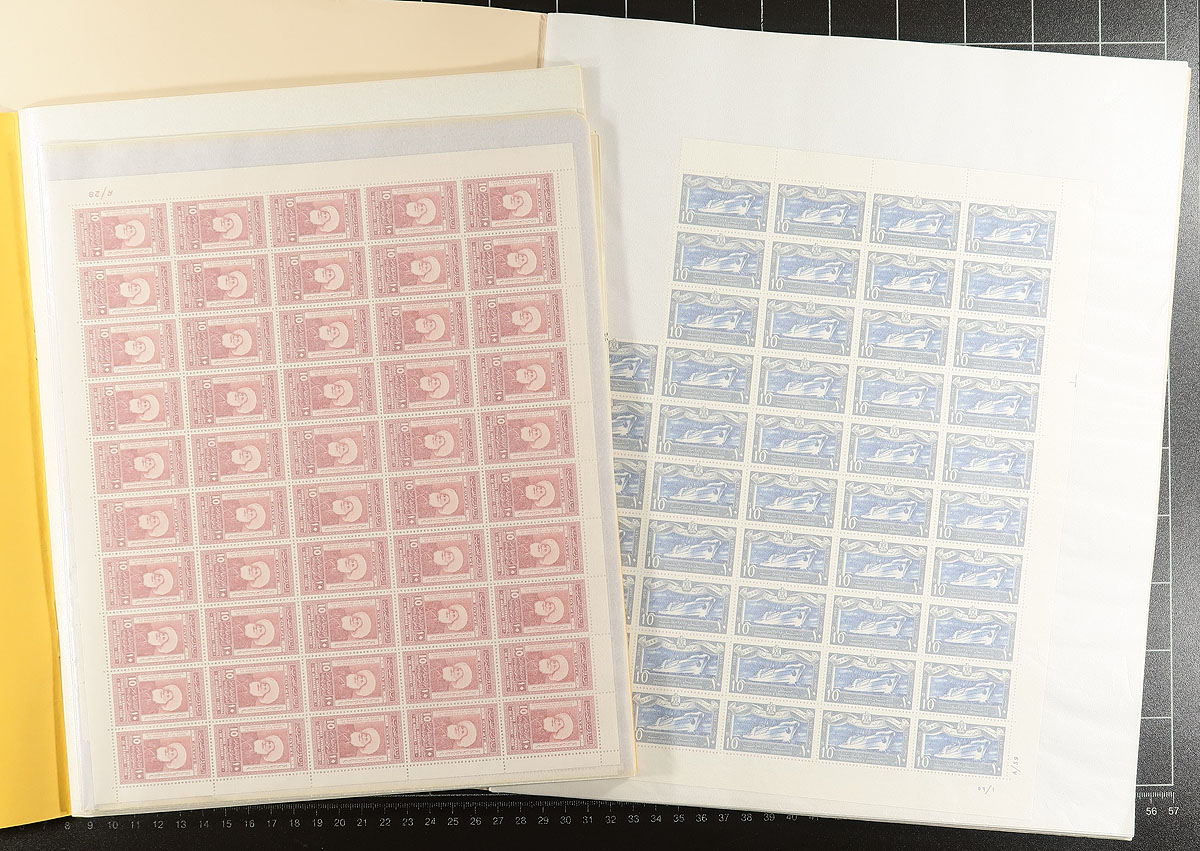 A pair of mint sheet files with complete sheets and partial sheets with a scattering of commemoratives from the 1930’s-1950’s. Includes three sheets each of #153-154 (from the Cairo Medical Conference). There is one sheet each of #258-264 and #292-294, with two sheets each of #296-298. The small sheetlet #447-451 has 17 panes of 25 (plus a partial pane and CTO pane not counted) finishing with #467-472 in panes with three stamps missing from the upper left corner, leaving 47 stamps each. Overall condition is quite good with stamps being never hinged, and only minor faults noted. 2024 Scott US$1616.45 =