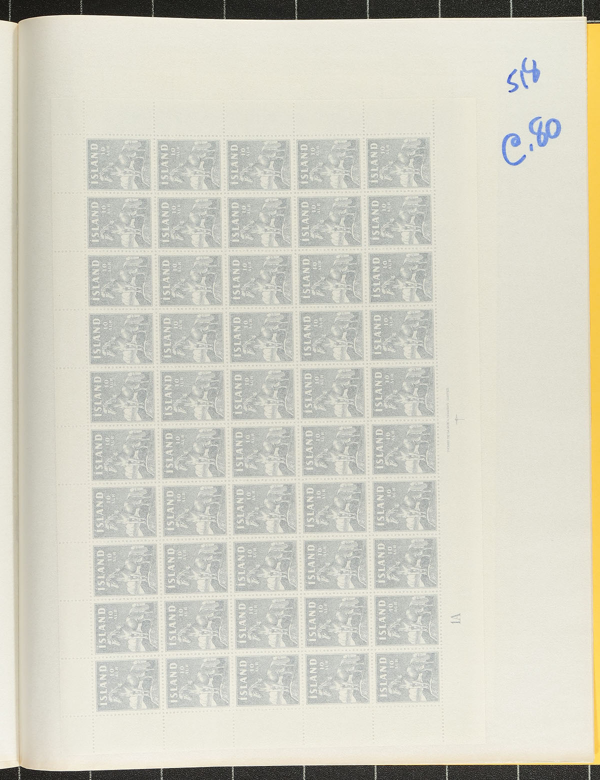 Scandinavia. Complete panes of Iceland and Greenland. The Iceland includes one pane each from #257/290, plus a pane of 20 of #511 and wholesale quantities of the "Horse" #311 (with 20 mint panes and 30 cancelled-to-order panes of 50). Greenland is a pair of stamps #2 and #3 from the first definitive issue, a lovely pane of 100, each. The mint stamps appear to be never hinged, with only a couple of minor edge faults seen. It comes in two mint sheet files. 2024 Scott US$1255.00 =