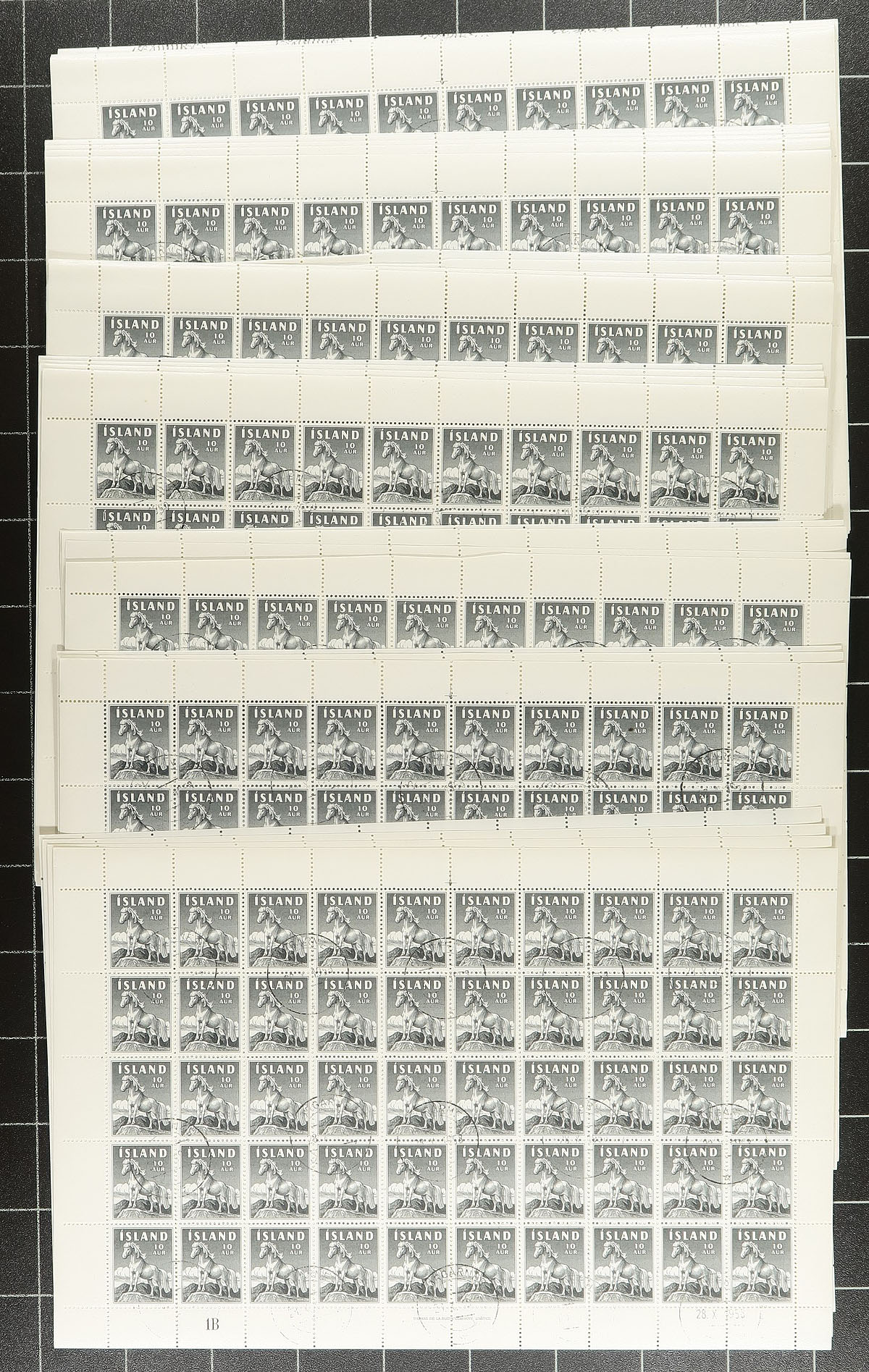 Scandinavia. Complete panes of Iceland and Greenland. The Iceland includes one pane each from #257/290, plus a pane of 20 of #511 and wholesale quantities of the "Horse" #311 (with 20 mint panes and 30 cancelled-to-order panes of 50). Greenland is a pair of stamps #2 and #3 from the first definitive issue, a lovely pane of 100, each. The mint stamps appear to be never hinged, with only a couple of minor edge faults seen. It comes in two mint sheet files. 2024 Scott US$1255.00 =