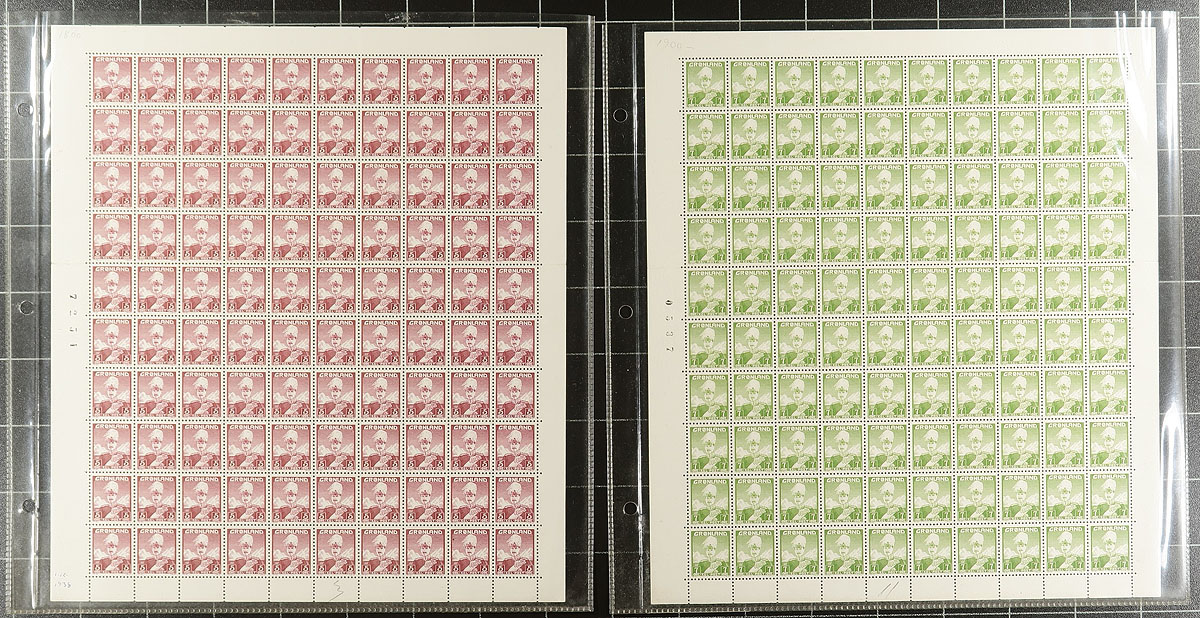 Scandinavia. Complete panes of Iceland and Greenland. The Iceland includes one pane each from #257/290, plus a pane of 20 of #511 and wholesale quantities of the "Horse" #311 (with 20 mint panes and 30 cancelled-to-order panes of 50). Greenland is a pair of stamps #2 and #3 from the first definitive issue, a lovely pane of 100, each. The mint stamps appear to be never hinged, with only a couple of minor edge faults seen. It comes in two mint sheet files. 2024 Scott US$1255.00 =