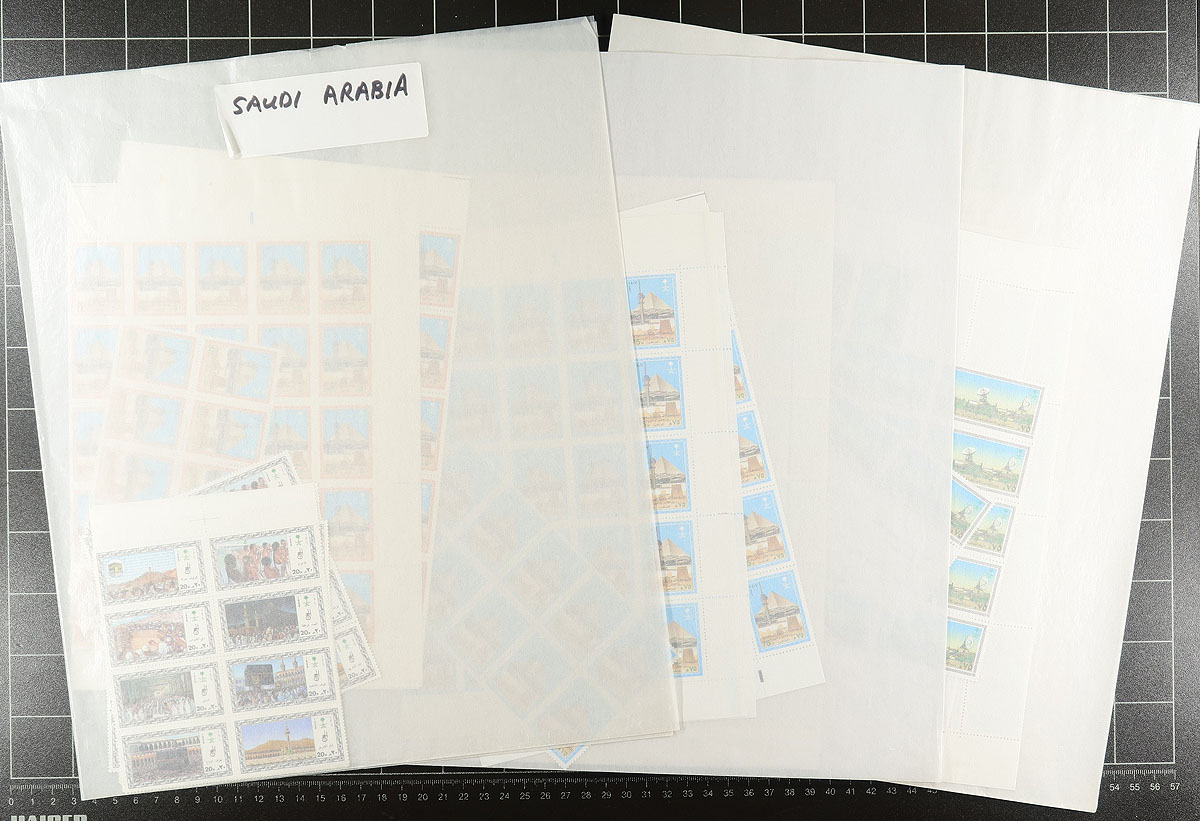 A group of multiples from 1986-1987 with six blocks of #1002 (Pilgrimage to Mecca) and then 100 or 110 copies each of #1047-1057 (usually in a couple of complete panes and a couple of extra blocks). All are mint never hinged in glassine pages. Not often seen material. The face value of the stamps is over C$250.00, perfect if you are planning on doing a mailing during your next trip to Riyadh! 2024 Scott US$1520.50 =