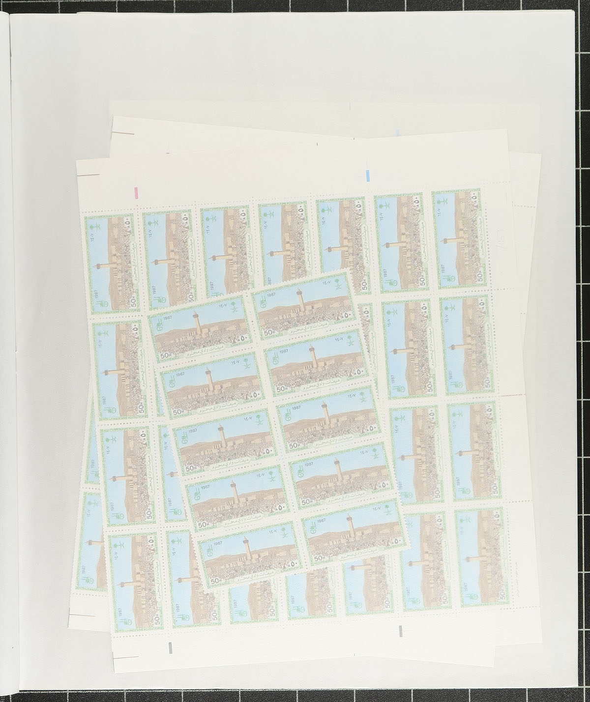 A group of multiples from 1986-1987 with six blocks of #1002 (Pilgrimage to Mecca) and then 100 or 110 copies each of #1047-1057 (usually in a couple of complete panes and a couple of extra blocks). All are mint never hinged in glassine pages. Not often seen material. The face value of the stamps is over C$250.00, perfect if you are planning on doing a mailing during your next trip to Riyadh! 2024 Scott US$1520.50 =
