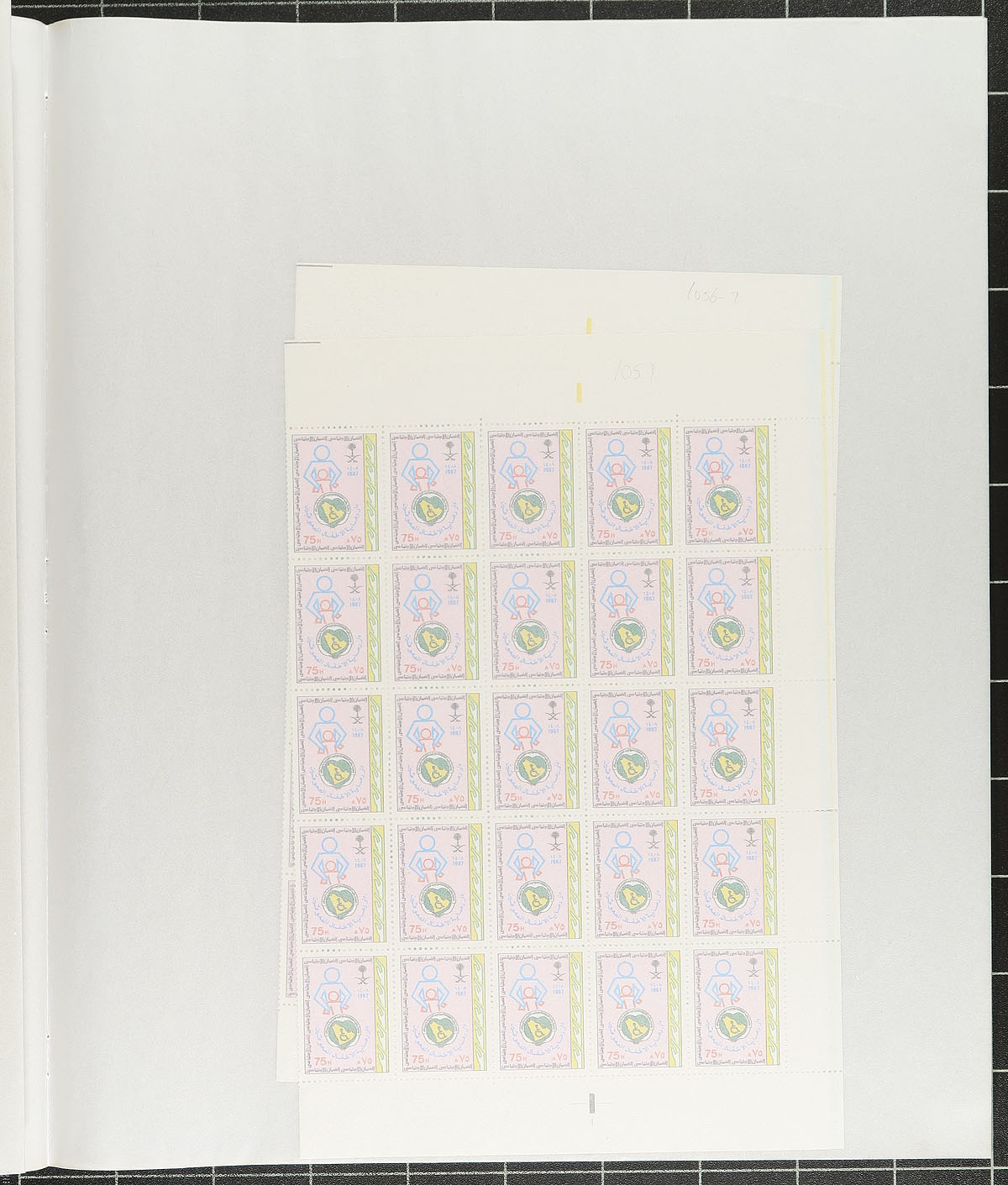 A group of multiples from 1986-1987 with six blocks of #1002 (Pilgrimage to Mecca) and then 100 or 110 copies each of #1047-1057 (usually in a couple of complete panes and a couple of extra blocks). All are mint never hinged in glassine pages. Not often seen material. The face value of the stamps is over C$250.00, perfect if you are planning on doing a mailing during your next trip to Riyadh! 2024 Scott US$1520.50 =
