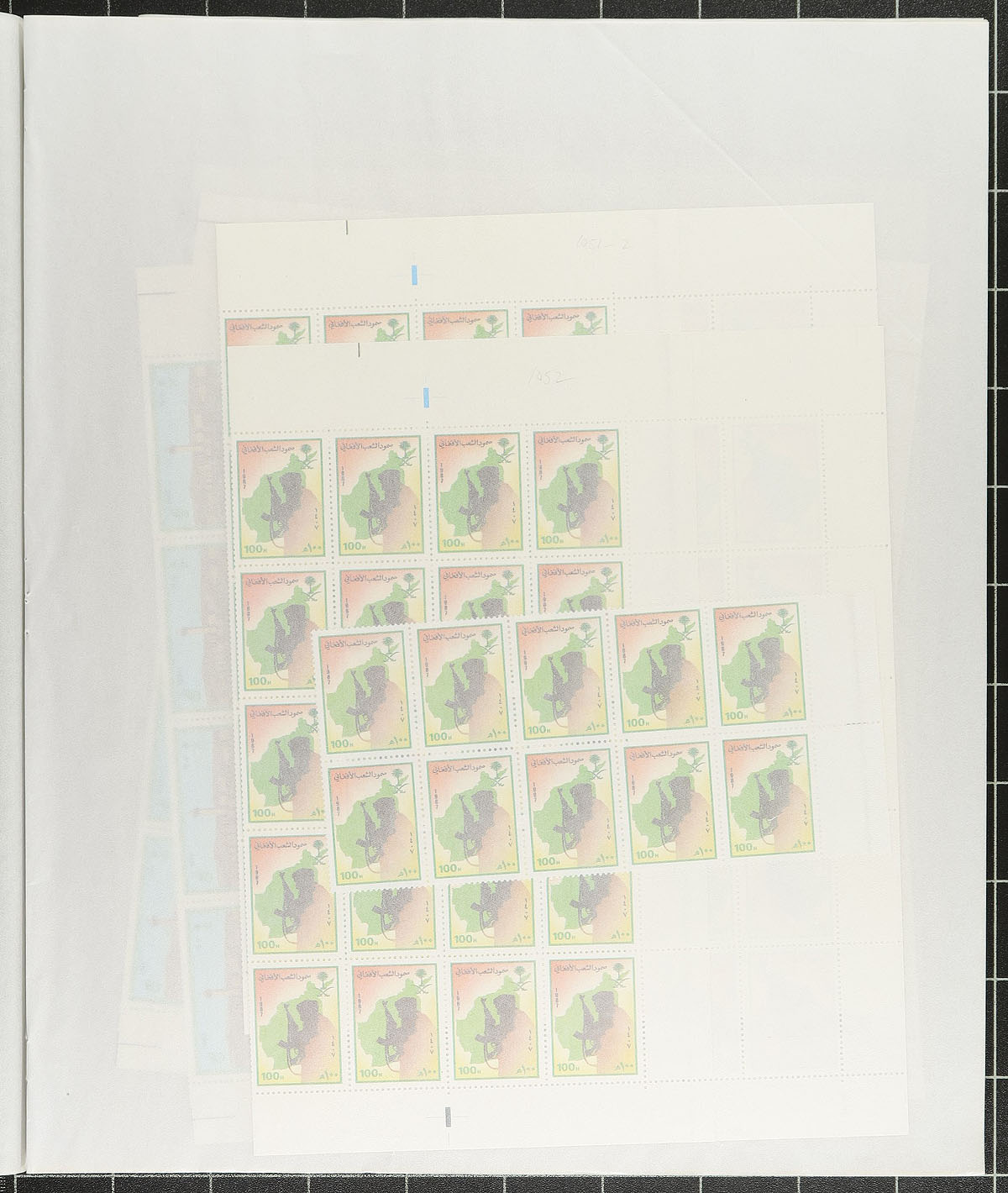 A group of multiples from 1986-1987 with six blocks of #1002 (Pilgrimage to Mecca) and then 100 or 110 copies each of #1047-1057 (usually in a couple of complete panes and a couple of extra blocks). All are mint never hinged in glassine pages. Not often seen material. The face value of the stamps is over C$250.00, perfect if you are planning on doing a mailing during your next trip to Riyadh! 2024 Scott US$1520.50 =