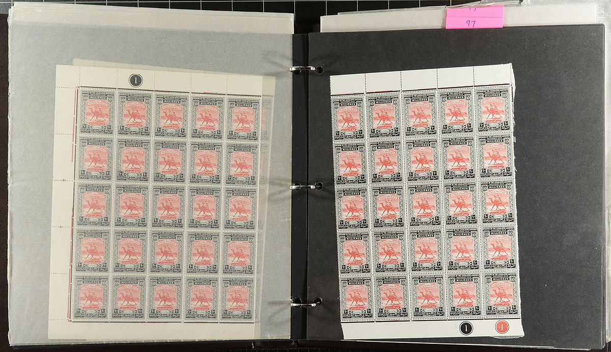 A wholesale lot of complete panes, plus large and small multiples of six different versions of the popular "Postman on Camel" design. With over 400 copies each of #95-97, the 1948 commemorative, large format, stamps and then a pane each of the 1954 "Self-Government" issue. Most of the panes are folded to fit in the high quality "SuperSafe" mint sheet binder. Almost all are never hinged, but a couple of large blocks have adhesion to glassine interleaving. Lots of cylinder numbers in the selvedge. Eye catching works of art. 2024 Scott US$1460.00 =