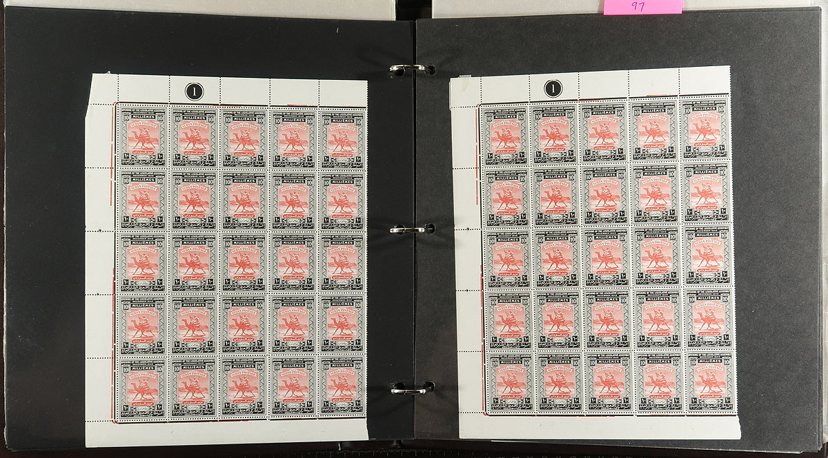 A wholesale lot of complete panes, plus large and small multiples of six different versions of the popular "Postman on Camel" design. With over 400 copies each of #95-97, the 1948 commemorative, large format, stamps and then a pane each of the 1954 "Self-Government" issue. Most of the panes are folded to fit in the high quality "SuperSafe" mint sheet binder. Almost all are never hinged, but a couple of large blocks have adhesion to glassine interleaving. Lots of cylinder numbers in the selvedge. Eye catching works of art. 2024 Scott US$1460.00 =