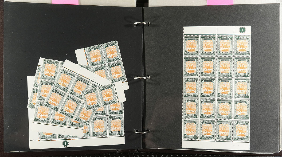 A wholesale lot of complete panes, plus large and small multiples of six different versions of the popular "Postman on Camel" design. With over 400 copies each of #95-97, the 1948 commemorative, large format, stamps and then a pane each of the 1954 "Self-Government" issue. Most of the panes are folded to fit in the high quality "SuperSafe" mint sheet binder. Almost all are never hinged, but a couple of large blocks have adhesion to glassine interleaving. Lots of cylinder numbers in the selvedge. Eye catching works of art. 2024 Scott US$1460.00 =