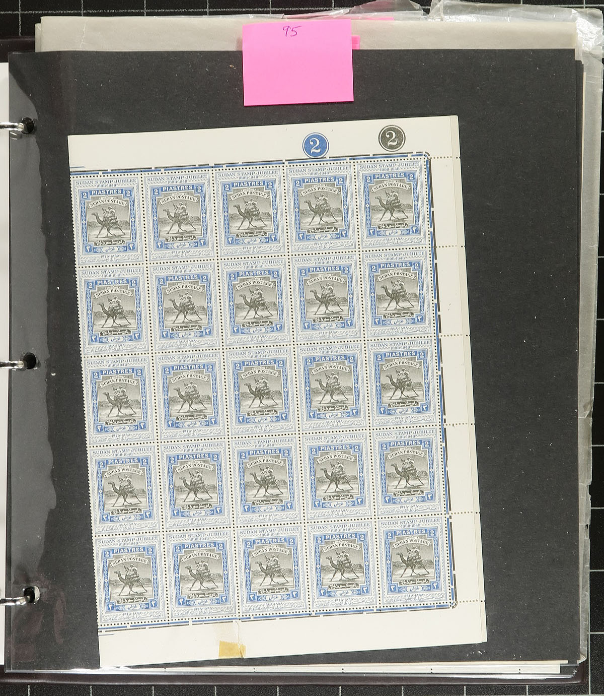 A wholesale lot of complete panes, plus large and small multiples of six different versions of the popular "Postman on Camel" design. With over 400 copies each of #95-97, the 1948 commemorative, large format, stamps and then a pane each of the 1954 "Self-Government" issue. Most of the panes are folded to fit in the high quality "SuperSafe" mint sheet binder. Almost all are never hinged, but a couple of large blocks have adhesion to glassine interleaving. Lots of cylinder numbers in the selvedge. Eye catching works of art. 2024 Scott US$1460.00 =