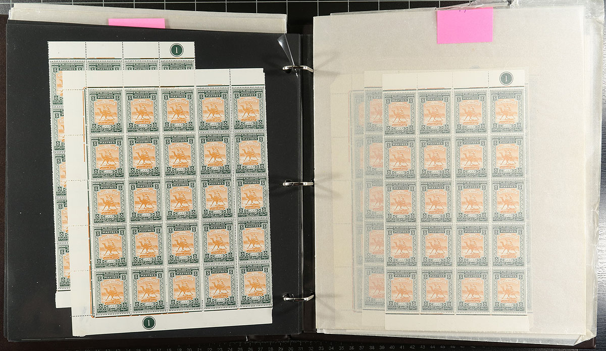 A wholesale lot of complete panes, plus large and small multiples of six different versions of the popular "Postman on Camel" design. With over 400 copies each of #95-97, the 1948 commemorative, large format, stamps and then a pane each of the 1954 "Self-Government" issue. Most of the panes are folded to fit in the high quality "SuperSafe" mint sheet binder. Almost all are never hinged, but a couple of large blocks have adhesion to glassine interleaving. Lots of cylinder numbers in the selvedge. Eye catching works of art. 2024 Scott US$1460.00 =