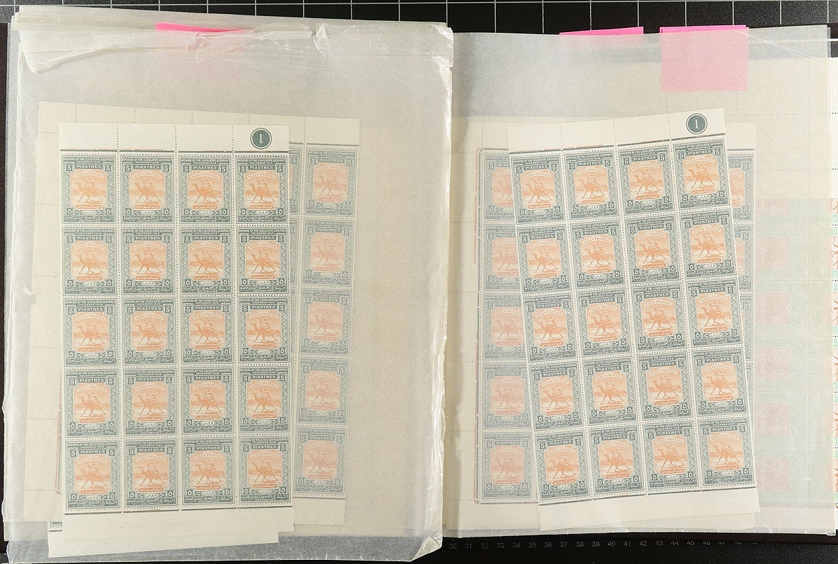 A wholesale lot of complete panes, plus large and small multiples of six different versions of the popular "Postman on Camel" design. With over 400 copies each of #95-97, the 1948 commemorative, large format, stamps and then a pane each of the 1954 "Self-Government" issue. Most of the panes are folded to fit in the high quality "SuperSafe" mint sheet binder. Almost all are never hinged, but a couple of large blocks have adhesion to glassine interleaving. Lots of cylinder numbers in the selvedge. Eye catching works of art. 2024 Scott US$1460.00 =