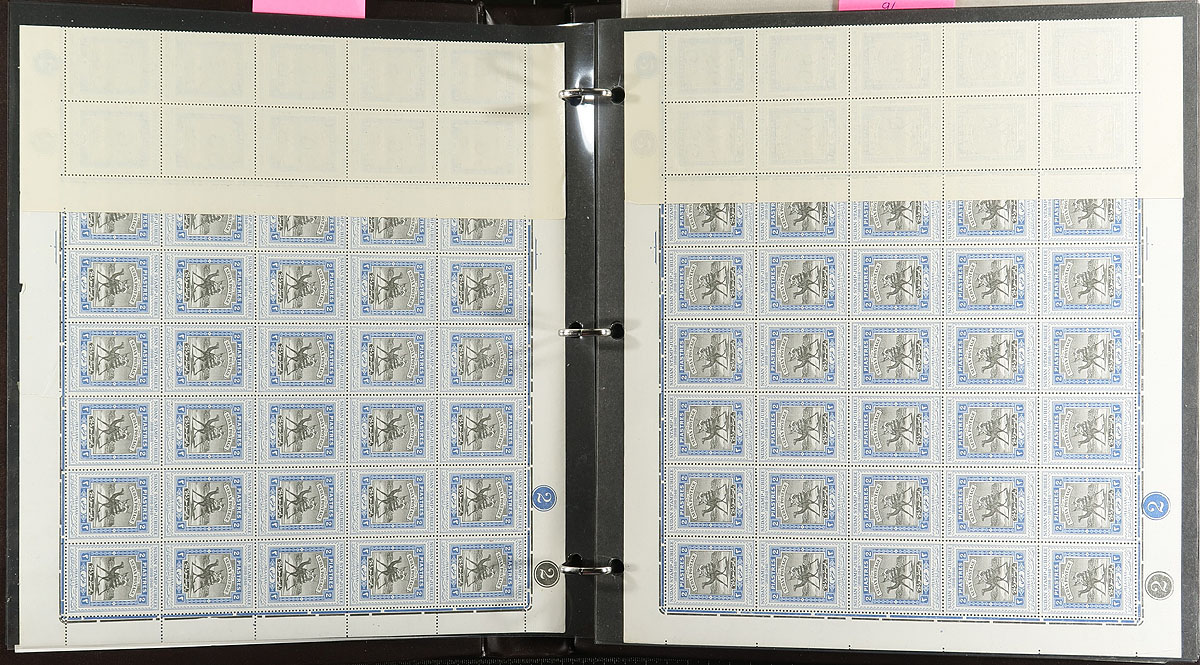 A wholesale lot of complete panes, plus large and small multiples of six different versions of the popular "Postman on Camel" design. With over 400 copies each of #95-97, the 1948 commemorative, large format, stamps and then a pane each of the 1954 "Self-Government" issue. Most of the panes are folded to fit in the high quality "SuperSafe" mint sheet binder. Almost all are never hinged, but a couple of large blocks have adhesion to glassine interleaving. Lots of cylinder numbers in the selvedge. Eye catching works of art. 2024 Scott US$1460.00 =