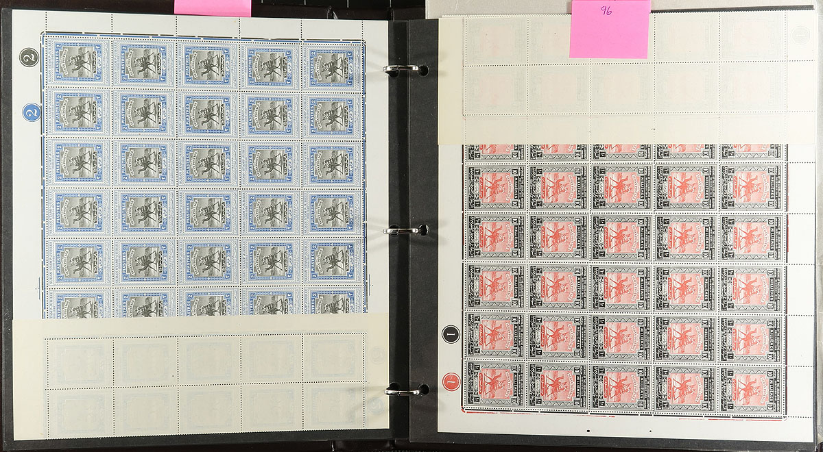 A wholesale lot of complete panes, plus large and small multiples of six different versions of the popular "Postman on Camel" design. With over 400 copies each of #95-97, the 1948 commemorative, large format, stamps and then a pane each of the 1954 "Self-Government" issue. Most of the panes are folded to fit in the high quality "SuperSafe" mint sheet binder. Almost all are never hinged, but a couple of large blocks have adhesion to glassine interleaving. Lots of cylinder numbers in the selvedge. Eye catching works of art. 2024 Scott US$1460.00 =