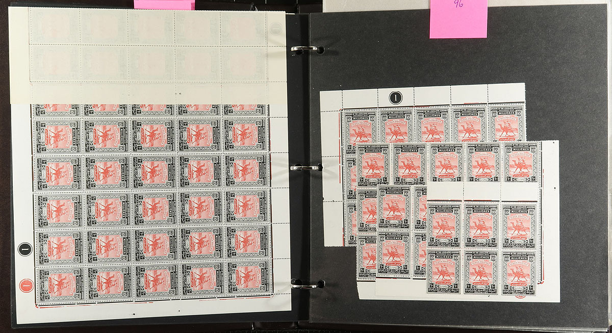 A wholesale lot of complete panes, plus large and small multiples of six different versions of the popular "Postman on Camel" design. With over 400 copies each of #95-97, the 1948 commemorative, large format, stamps and then a pane each of the 1954 "Self-Government" issue. Most of the panes are folded to fit in the high quality "SuperSafe" mint sheet binder. Almost all are never hinged, but a couple of large blocks have adhesion to glassine interleaving. Lots of cylinder numbers in the selvedge. Eye catching works of art. 2024 Scott US$1460.00 =
