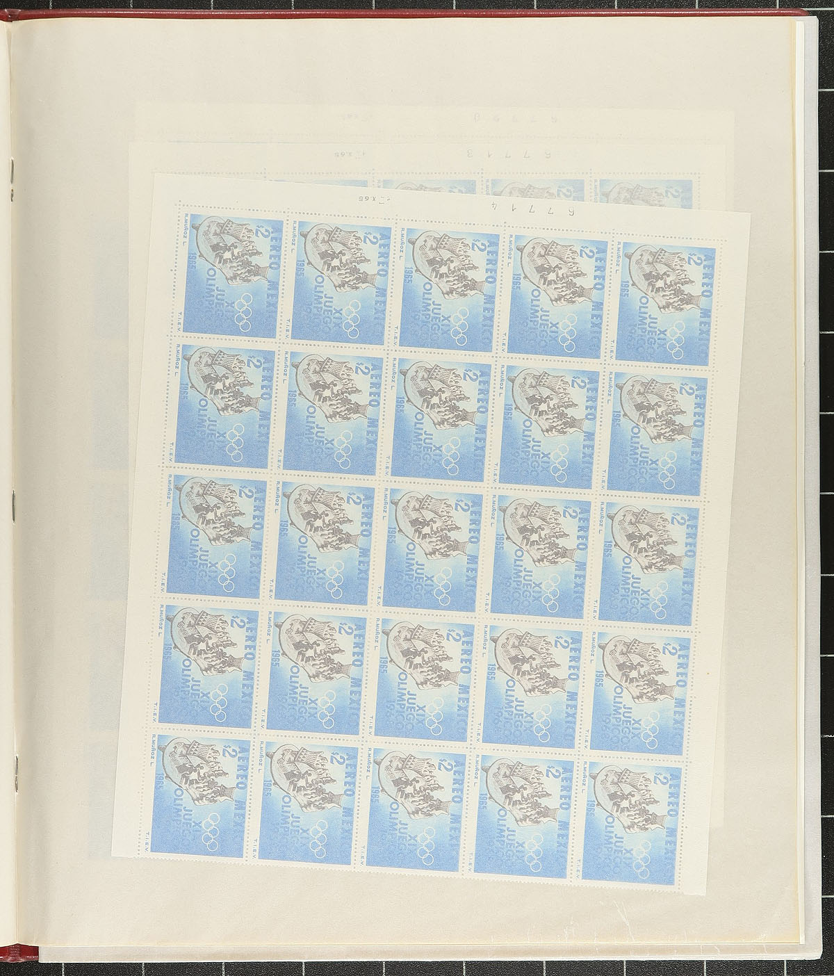 Accumulation of complete panes or large blocks. Starts with the 1965 issue announcing the 1968 Mexico Summer Olympic Games (both the regular issues and the air mails, with 125 complete sets plus a lot of extras). There is also a trio of complete panes (2 regular issue, 1 airmail) from the very popular 1975 "Export" issue (2 or 3 panes of each issue). A quick check indicates that all are mint, never hinged. 2024 Scott US$1546.25 =