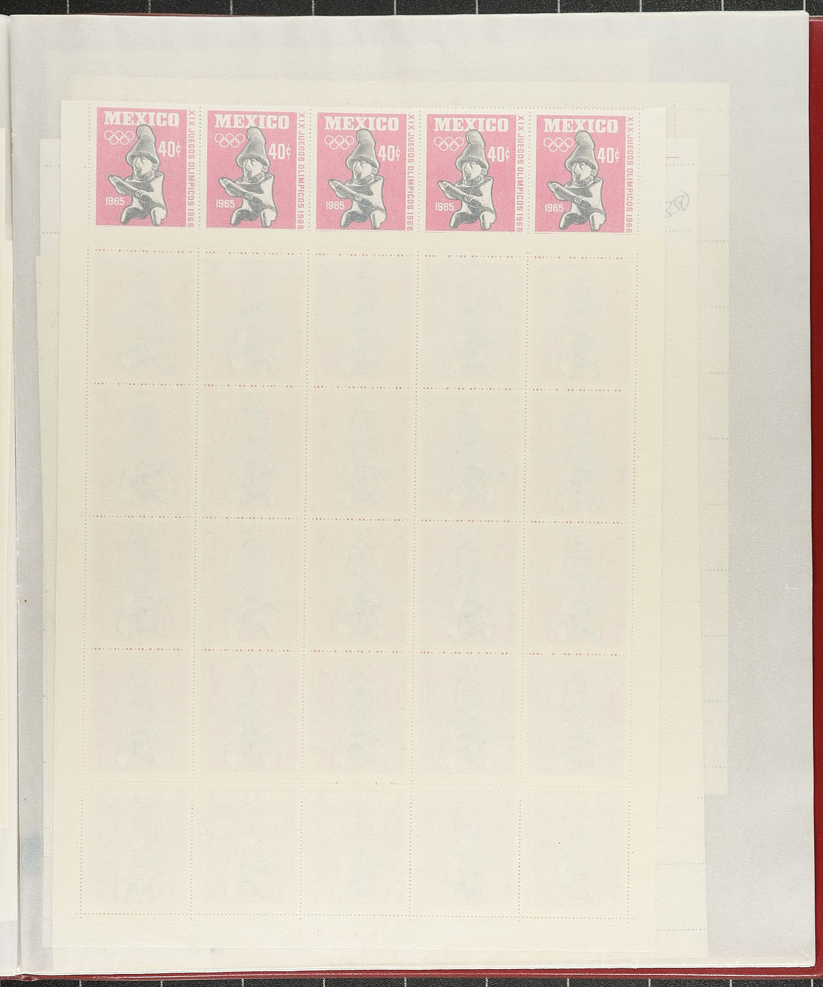 Accumulation of complete panes or large blocks. Starts with the 1965 issue announcing the 1968 Mexico Summer Olympic Games (both the regular issues and the air mails, with 125 complete sets plus a lot of extras). There is also a trio of complete panes (2 regular issue, 1 airmail) from the very popular 1975 "Export" issue (2 or 3 panes of each issue). A quick check indicates that all are mint, never hinged. 2024 Scott US$1546.25 =