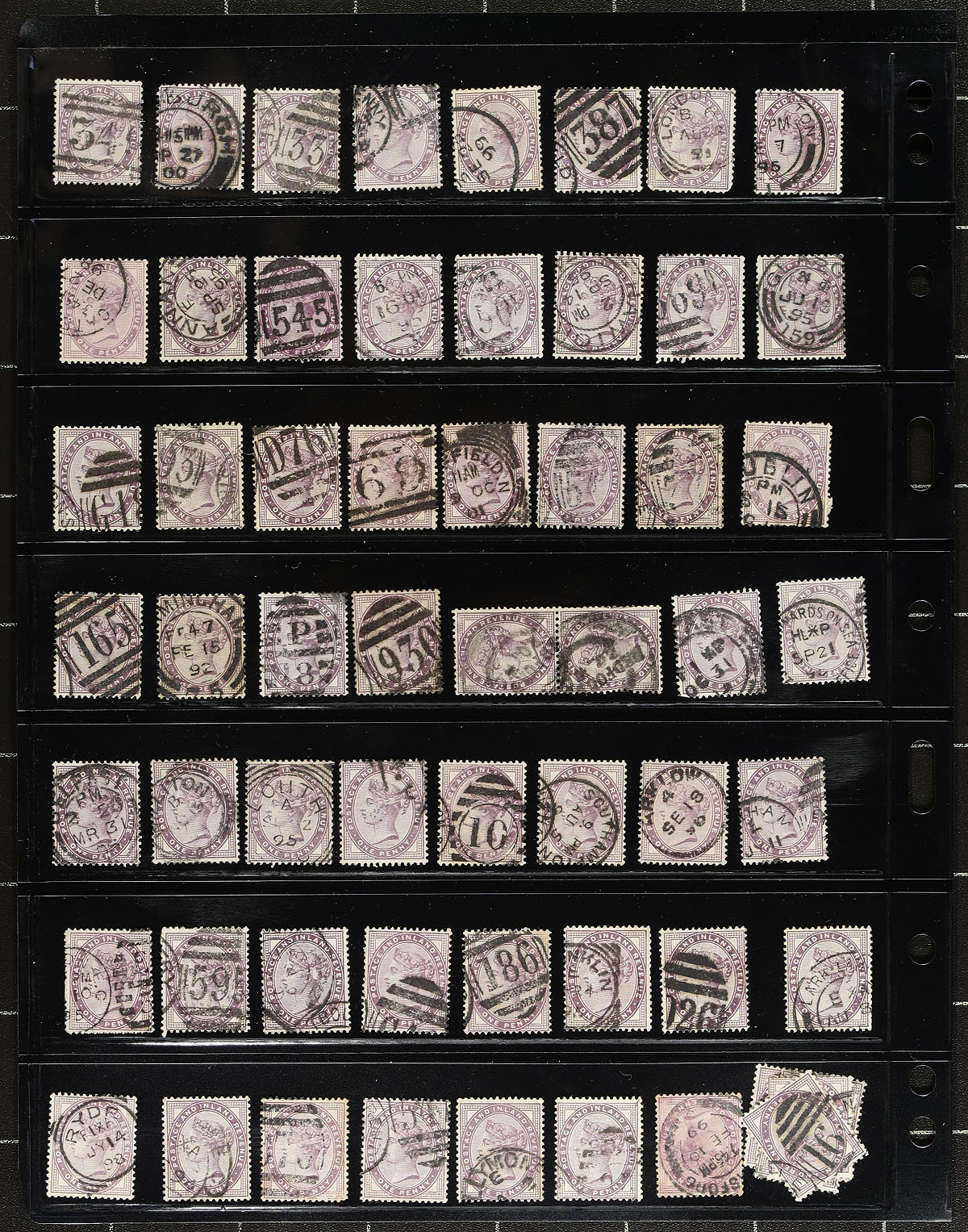 Wholesale accumulation of over 700 used examples of the 1d Lilac, Queen Victoria definitive from 1881. There are seven glassine envelopes of at least 100 copies each, as received from the consignor. Two glassines worth were put onto black stockpages to give you a sense of what is here. Despite purporting to have 200 copies, there were almost 230 stamps inside. We have left the remaining 5 glassines intact, but they appear to have a wide diversity of usages, shades. While we aren’t making any promises, the indication is that they haven’t been checked to find copies of #88 (the 14 dot corner angles). Perfect for cancel, shade or calendar collectors. Expect a few faults, but overall clean. 2024 Scott US$1855.00 =