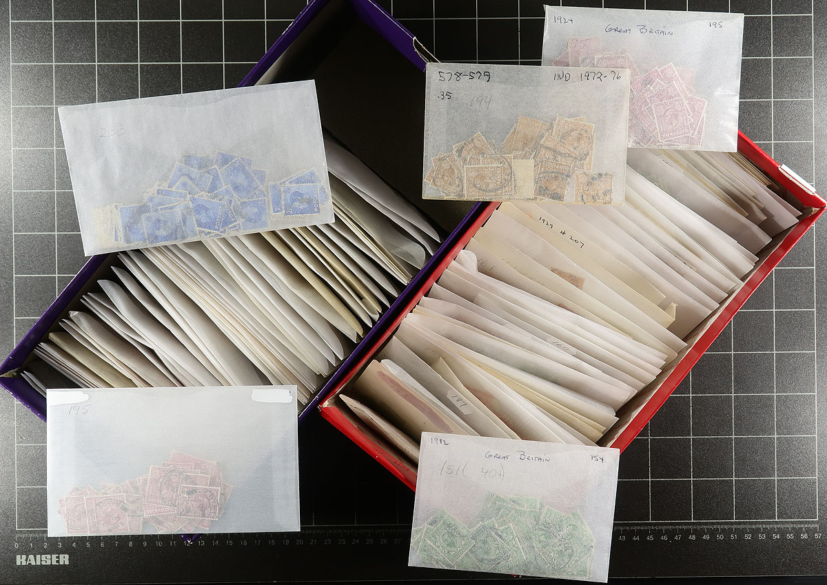 Super accumulation Part B: King George V and King Edward VIII, a large assortment of used off-paper stamps, meticulously sorted into #5 sized glassine envelopes, with a pencil notation of its Scott catalogue number and the approximate (conservative) quantity of its contents. By definition most are cheaper stamps, but we noted lots of Seahorses #179-181 and #222-223 (no PUC £ or British Empire Exhibition). There is ample material to study shades, cancels and plate flaws. Fills a pair of shoeboxes. The catalogue value will be several thousand dollars. Estimate =