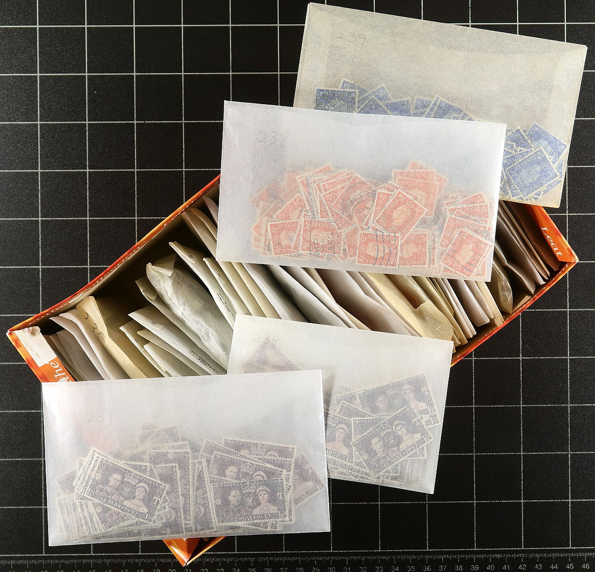 Super accumulation Part C: King George VI a large assortment of used off-paper stamps, meticulously sorted into #5 sized glassine envelopes, with a pencil notation of its Scott catalogue number and the approximate (conservative) quantity of its contents. By definition most are cheaper stamps, but we noted higher values such as #251A, 275, 288-289 (no £ value Silver Wedding). There is ample material to study shades, cancels and plate flaws. Fills FOUR shoeboxes AND a squat/wide "red box", so tens of thousands stamps. The catalogue value will be a few thousand dollars. Estimate =