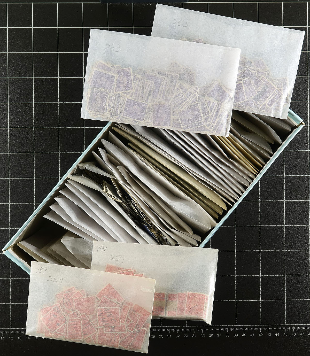 Super accumulation Part C: King George VI a large assortment of used off-paper stamps, meticulously sorted into #5 sized glassine envelopes, with a pencil notation of its Scott catalogue number and the approximate (conservative) quantity of its contents. By definition most are cheaper stamps, but we noted higher values such as #251A, 275, 288-289 (no £ value Silver Wedding). There is ample material to study shades, cancels and plate flaws. Fills FOUR shoeboxes AND a squat/wide "red box", so tens of thousands stamps. The catalogue value will be a few thousand dollars. Estimate =