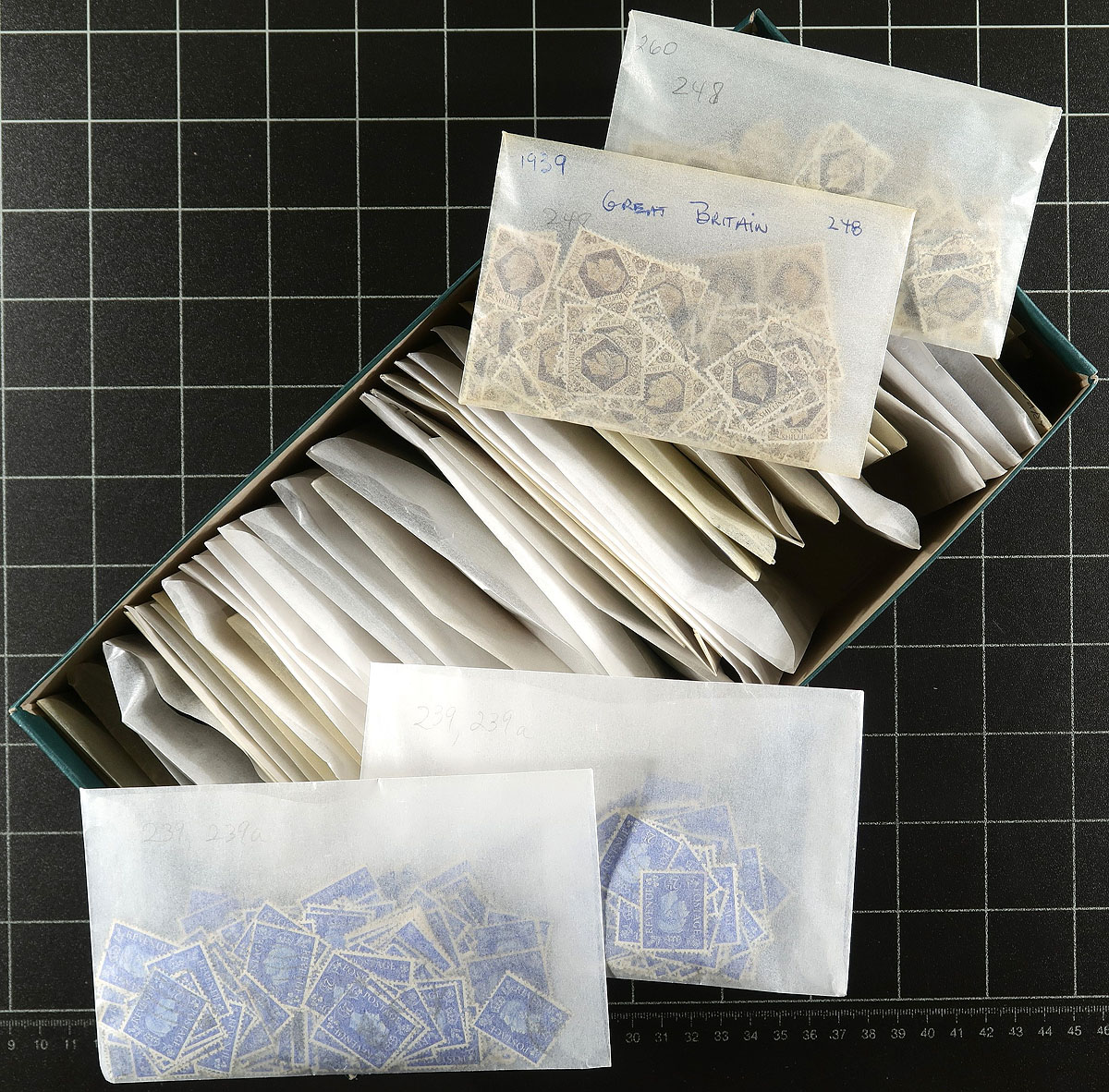 Super accumulation Part C: King George VI a large assortment of used off-paper stamps, meticulously sorted into #5 sized glassine envelopes, with a pencil notation of its Scott catalogue number and the approximate (conservative) quantity of its contents. By definition most are cheaper stamps, but we noted higher values such as #251A, 275, 288-289 (no £ value Silver Wedding). There is ample material to study shades, cancels and plate flaws. Fills FOUR shoeboxes AND a squat/wide "red box", so tens of thousands stamps. The catalogue value will be a few thousand dollars. Estimate =