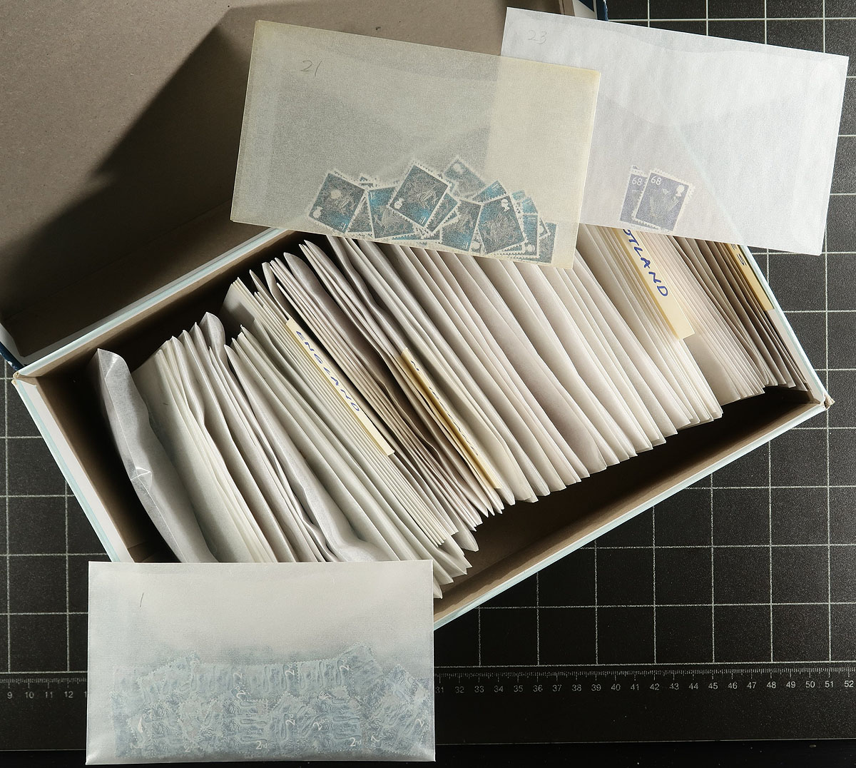 Part of the "super accumulation" offered in this sale, this lot features Queen Elizabeth II used non-Machin issues. A large assortment of used off-paper stamps, meticulously sorted into #5 sized glassine envelopes, with a pencil notation of its Scott catalogue number and the approximate (conservative) quantity of its contents. We note England #1/18, Northern Ireland #1/14, Scotland (#1/27, noted 20 copies of #17) and Wales #1/23. By definition most are cheaper stamps, and while there are quantities of the 1950’s-1960’s issues, the value is in the 2000’s issues (often 1st, 2nd, E and 64p values), in quantities with stamps having individual catalogue values from US$1.50-$2.90. Fills a shoebox, with a couple thousand stamps. The catalogue value will add up quickly. Estimate =