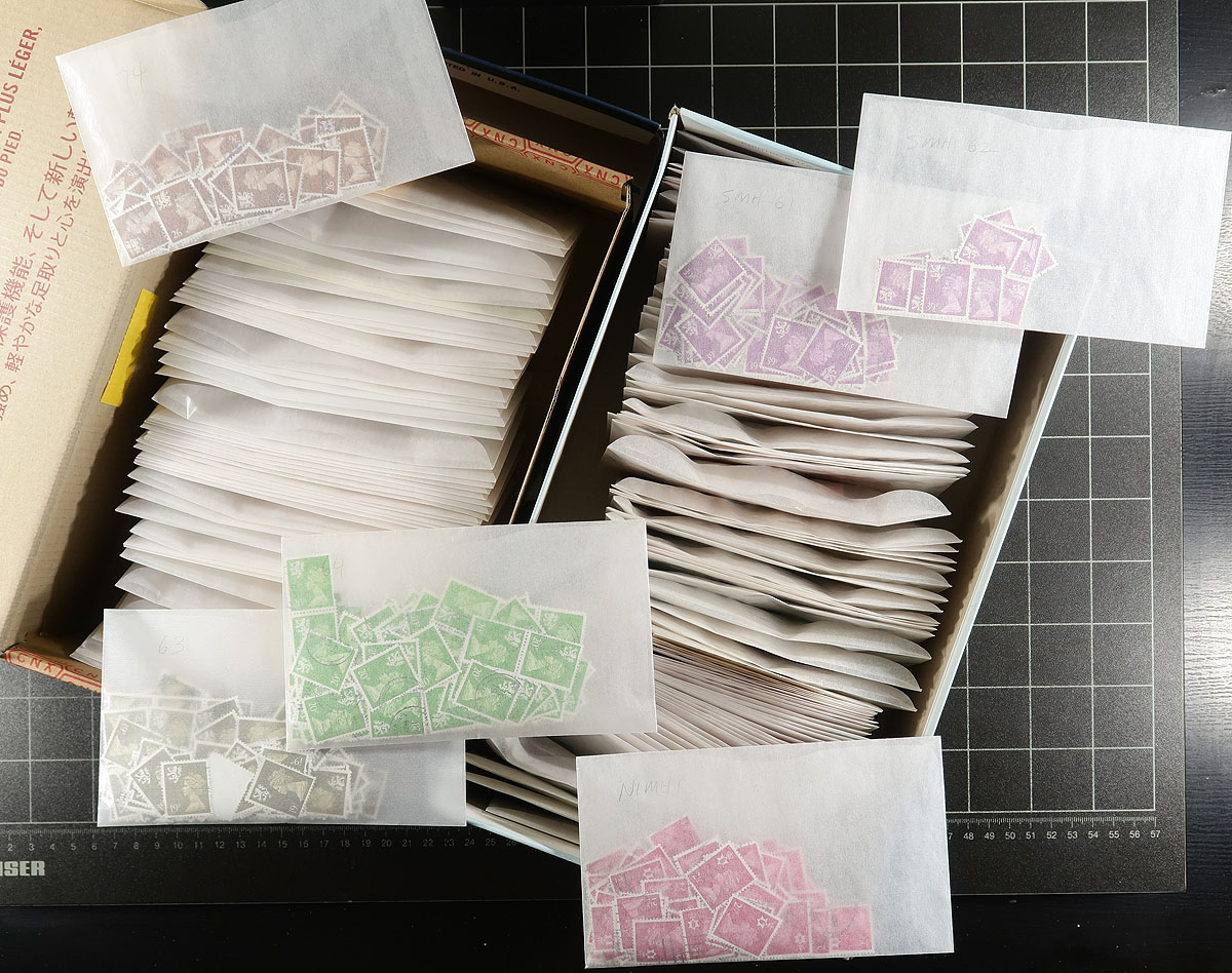 The next installment of the "super accumulation" offered in this sale. This time the Queen Elizabeth II used Machin issues. A large assortment of used off-paper stamps, meticulously sorted into #5 sized glassine envelopes, with a pencil notation of its Scott catalogue number and the approximate (conservative) quantity of its contents. We note Northern Ireland #NIMH1/NIMH14, Scotland (#SMH1/SMH97, noted 75 copies of #SMH21a and 15 copies each of #SMH48 and #SMH62!), Wales #WMH1/WMH74 (with 20 copies of #WMH46). By definition most are cheaper stamps. Fills a pair of shoeboxes, with a few thousand stamps. The catalogue value is in the thousands. Estimate =