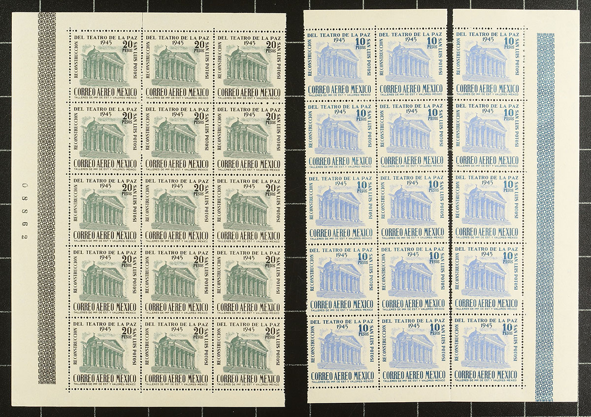 The 1945 "Reconstruction of Peace Theatre" set of 9 values (including both the regular and airmail issues) in 15 complete sets, all lovely mint never hinged. All in multiples ranging from strips of 3 to margin blocks of 15. Post Office fresh. 2024 Scott US$804.75 =
