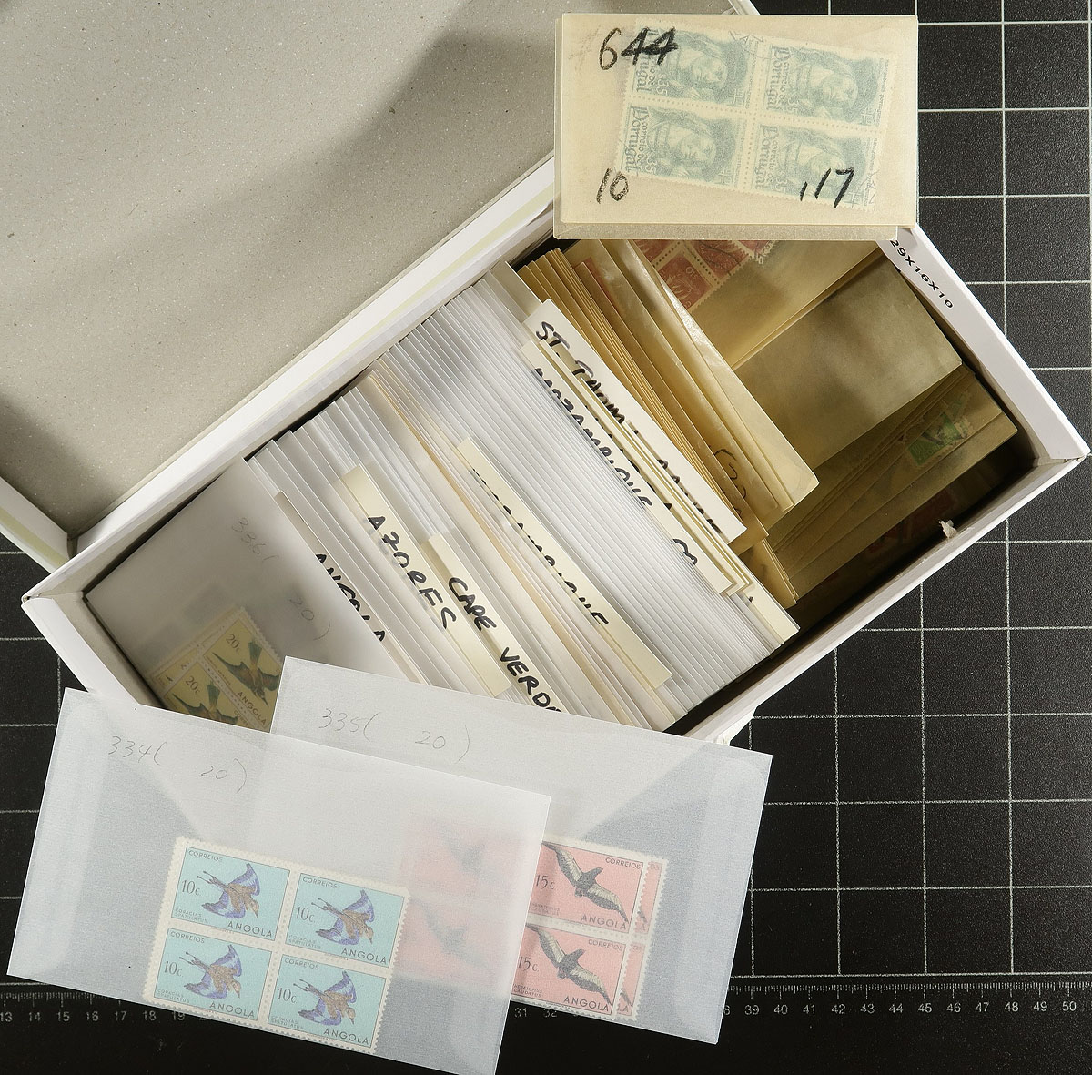 A small shoebox with an assortment of glassine envelopes holding an old-time accumulation of used post-war Portugal, followed by a more recent organized holding of mint and used colonial material from: Angola, Azores, Cape Verde, Macau, Mozambique, Nyassa and more. Offered as received. Estimate =