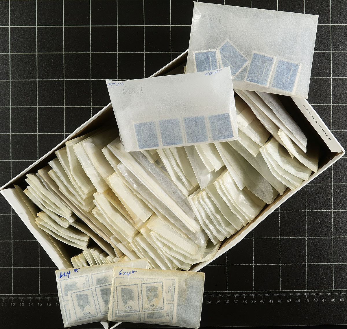Mint and used hoard Part B: Regular issues from 1961-1970, plus a smattering of issues up to the late 1990’s in huge quantities, often sorted into glassines, with some bundleware and roughly organized by Scott. There can be over 1000 of a type and Indonesian material from this era doesn’t usually surpass a dollar of catalogue value per stamp (didn’t see any souvenir sheets) - but there must be the better part of 100,000 stamps here, as these fill SIX shoeboxes. The condition is great, with most of the mint being never hinged. Estimate =