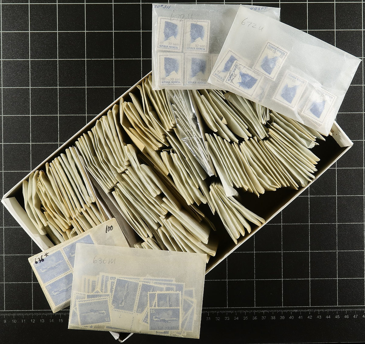 Mint and used hoard Part B: Regular issues from 1961-1970, plus a smattering of issues up to the late 1990’s in huge quantities, often sorted into glassines, with some bundleware and roughly organized by Scott. There can be over 1000 of a type and Indonesian material from this era doesn’t usually surpass a dollar of catalogue value per stamp (didn’t see any souvenir sheets) - but there must be the better part of 100,000 stamps here, as these fill SIX shoeboxes. The condition is great, with most of the mint being never hinged. Estimate =