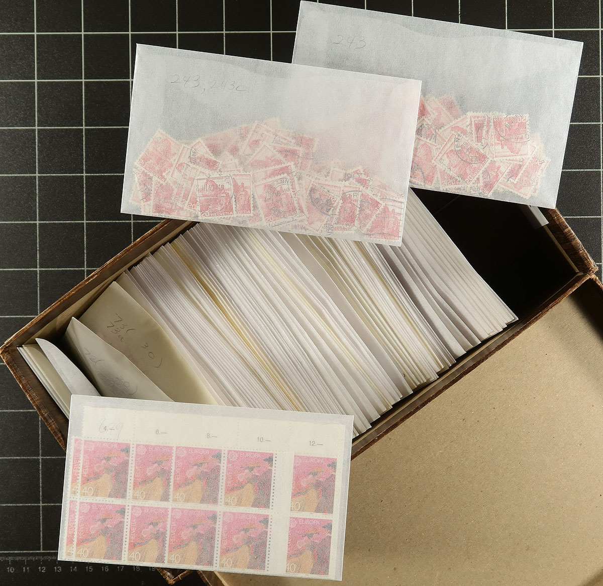 Used accumulation Part A: Pre-1939 regular issues including: "Numeral", "Standing Helvetica", Willem Tell (& Son) issues, with better singles of up to $15.00 catalogue value (like #206). Each is sorted into a glassine with typically 10-100 copies per envelope, and marked with its Scott catalogue number. Includes lots of nice cancels, some multiples and no indication that these have ever been checked with a specialist’s eye against Zumstein. All in a small brown index card box. Value and attractive examples throughout. Estimate =