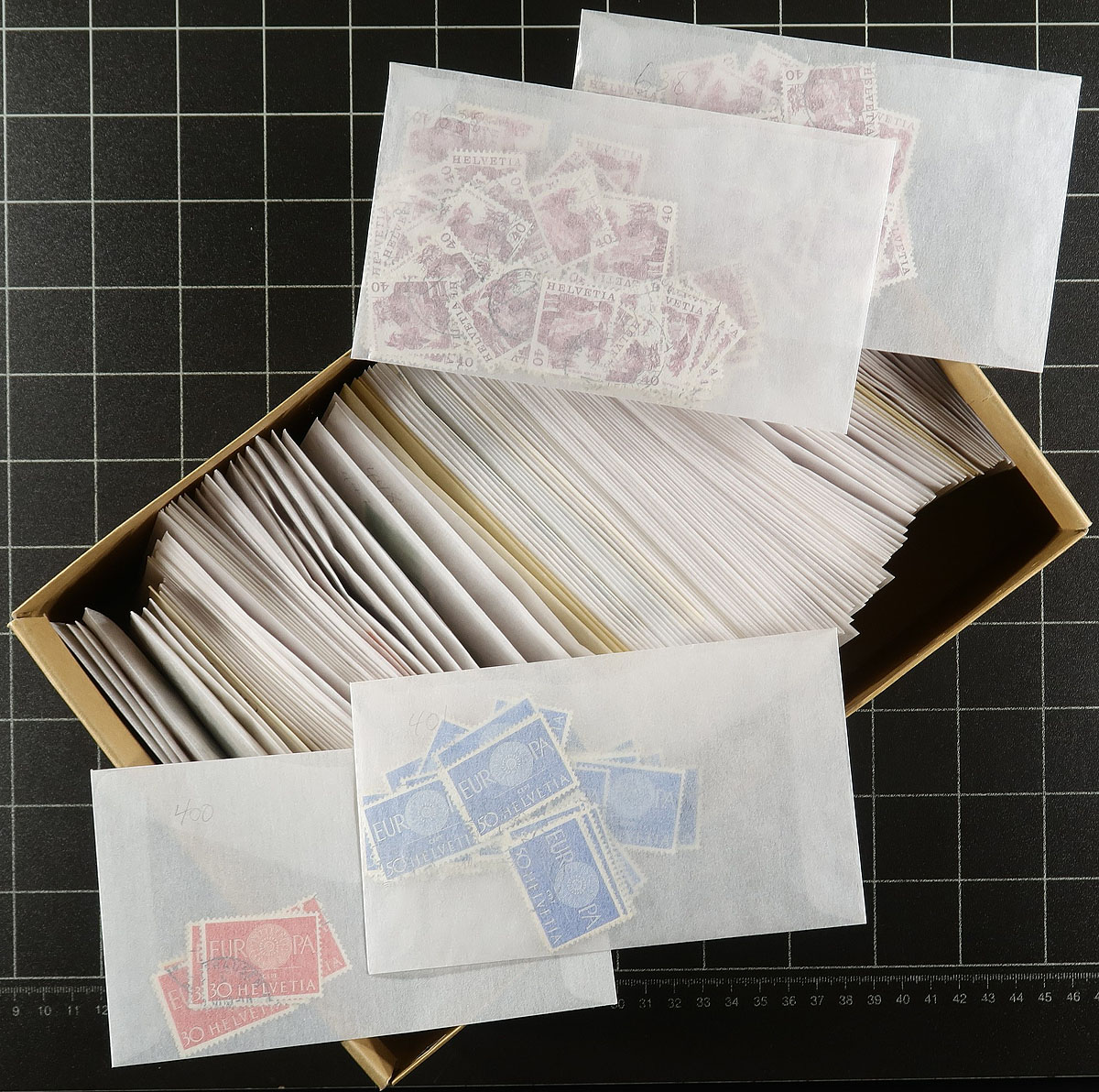 Used accumulation Part B: 1939-2008 regular issues, starting with the 1939 Exposition all nine stamps in three languages. With hit or miss coverage for the next 60+ years, with individual items cataloguing up to $8.00 each. Stamps are sorted by Scott number into a glassine with typically 10-100 copies per envelope, and marked with its Scott catalogue number. Includes lots of nice cancels, some multiples and no indication that these have ever been checked with a specialist’s eye against Zumstein. Fills THREE shoeboxes. Value and attractive examples throughout. Estimate =