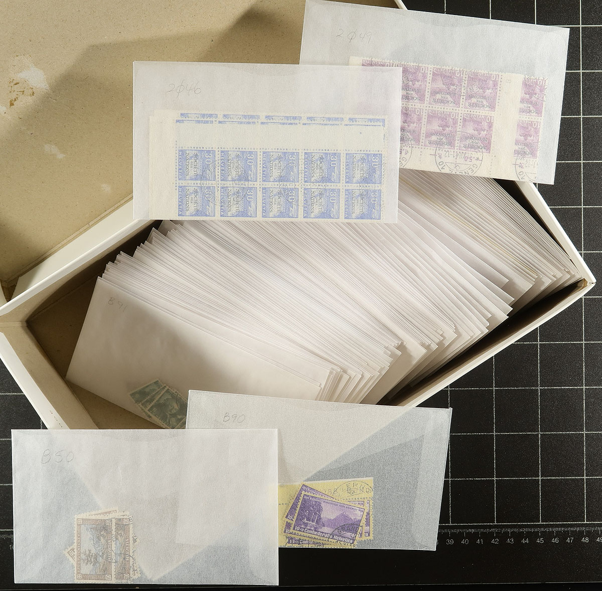 Used accumulation Part C: 1930’s to 2007 back of the book regular issues, mostly semi-postal issues with a touch of air mails and a trio of League of Nations issues. Hit or miss coverage f with individual items cataloguing up to $3.00 each. Stamps are sorted by Scott number into a glassine with typically 10-100 copies per envelope, and marked with its Scott catalogue number. Includes lots of nice cancels, some multiples and no indication that these have ever been checked with a specialist’s eye against Zumstein. Fills one half of a shoeboxes. We don’t often see modern used Swiss semi-postals in quantity. Estimate =