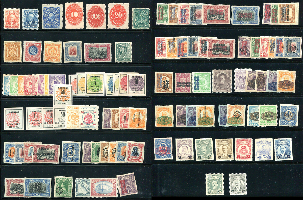 A nice collection of mint, regular issues, mostly 20th century up to 1921, with a very pleasing mix including the always interesting array of overprints. Includes a number of $10.00-$20.00 stamps, plus better such as #320, #437 and #625. Most are hinged, a couple have small hinge remnants and all are different, with only a couple of small faults seen. A very clean way to start your early Mexican collection. 2024 Scott US$524.15 =