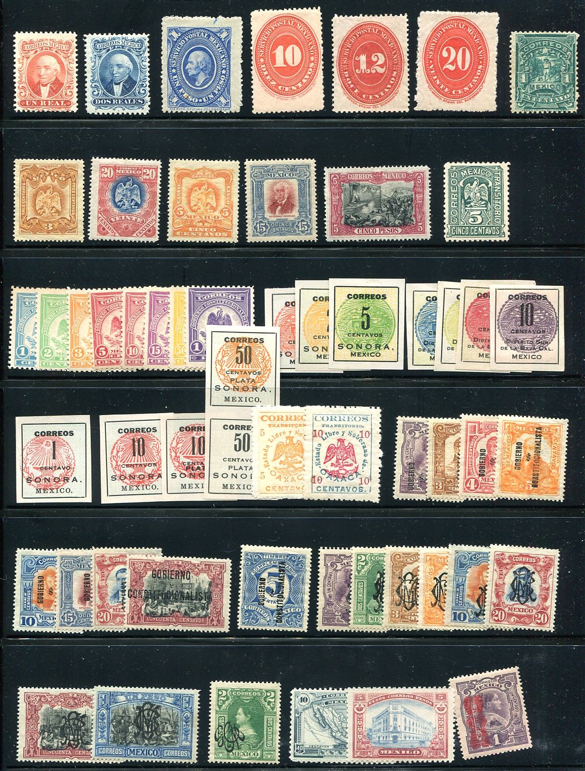 A nice collection of mint, regular issues, mostly 20th century up to 1921, with a very pleasing mix including the always interesting array of overprints. Includes a number of $10.00-$20.00 stamps, plus better such as #320, #437 and #625. Most are hinged, a couple have small hinge remnants and all are different, with only a couple of small faults seen. A very clean way to start your early Mexican collection. 2024 Scott US$524.15 =