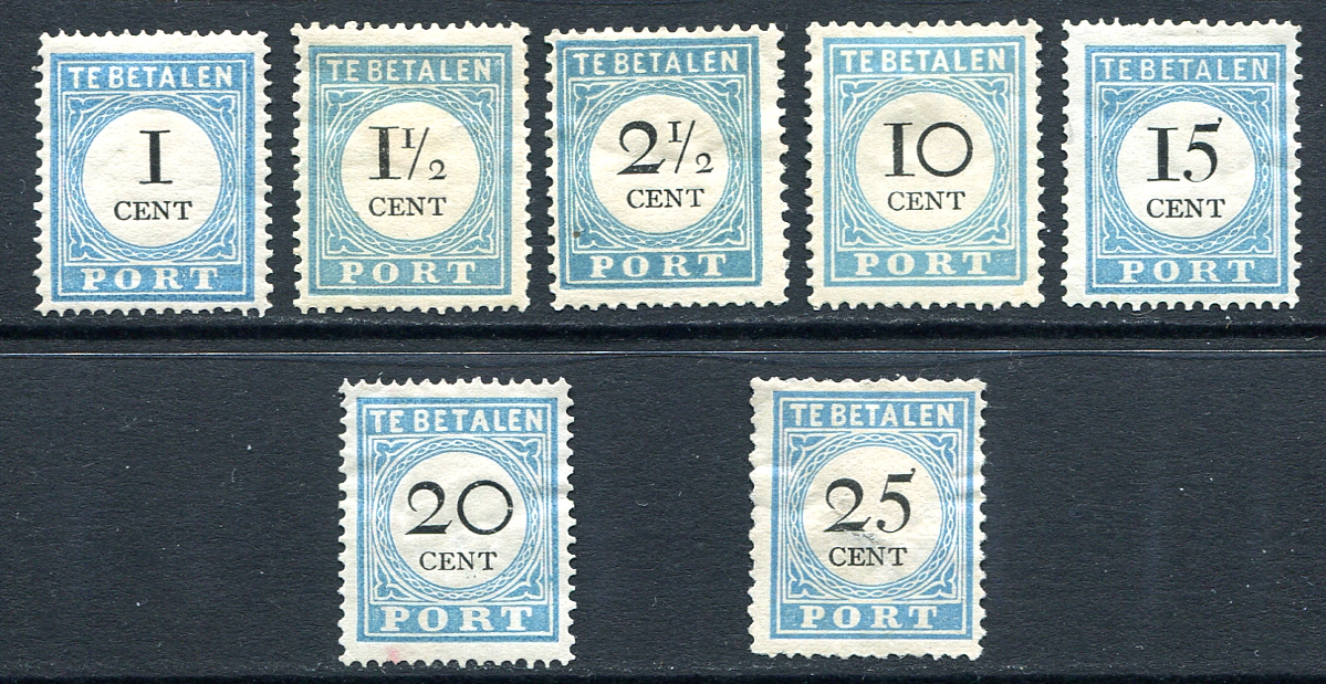 Seven different values of the blue and black postage dues from the 1881-1887 series. Includes #J3-J5, #J7, #J9b, #J10c, J11. A bit heavily hinged and #J10c with a minor tone spot. Tough early dues group. 2024 Scott US$623.50 =