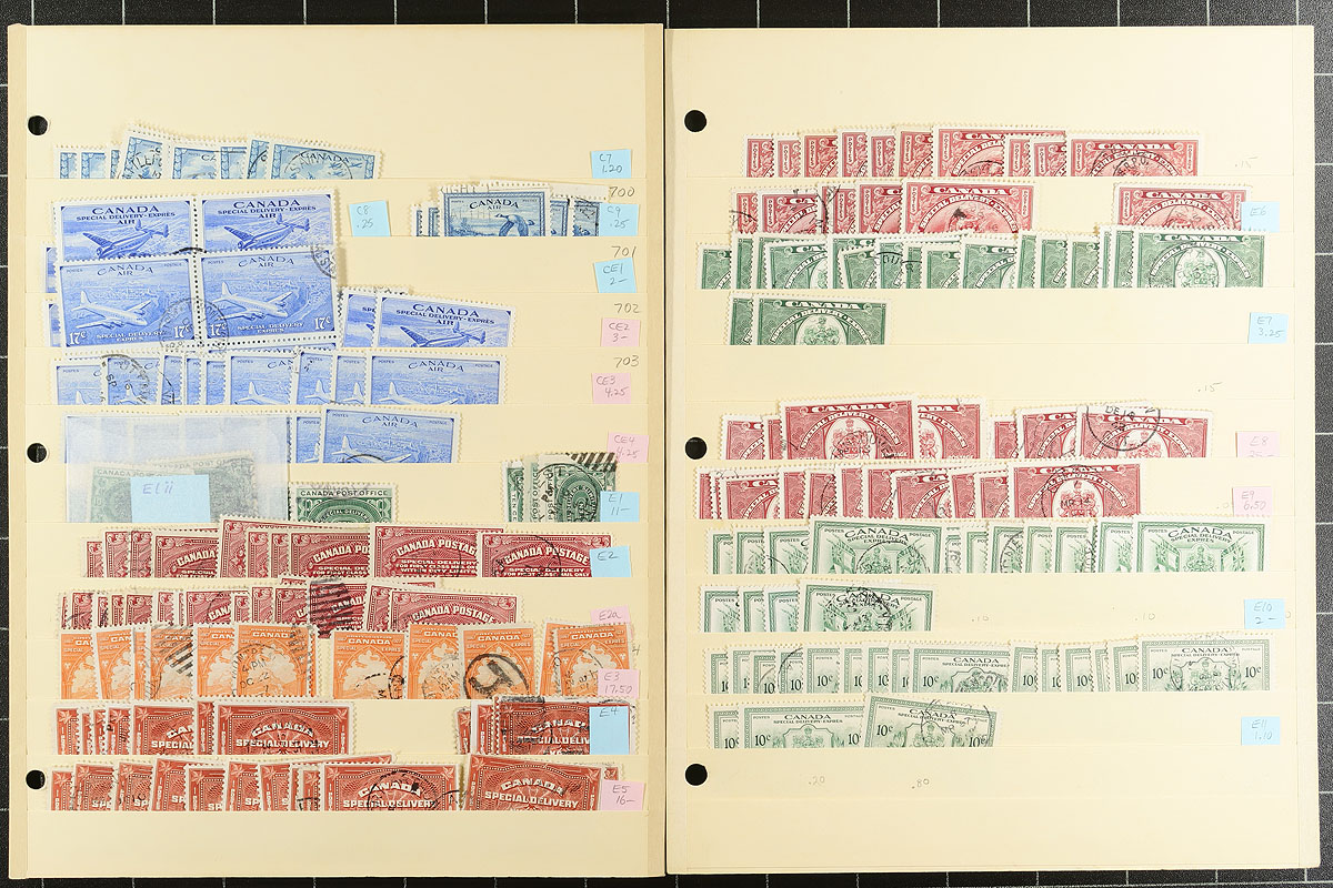 One collector’s used "Back of the Book" accumulation neatly organized onto 15 manila stockpages, including up to about 20 of a type and a few blocks. The semi-postals include the modern issues. Airmails include #C2 (11 copies), #C4 (20). There is a nice group of Special Delivery issues, noting E3, E4, E5 (10 each) and E8 (8). The registered stamps have some nice cancels and there is representation of both the purple and red dues. Very few faults noted, and lots of readable cancels are apparent. Total Scott catalogue value will approach US$3,000.00. Estimate =