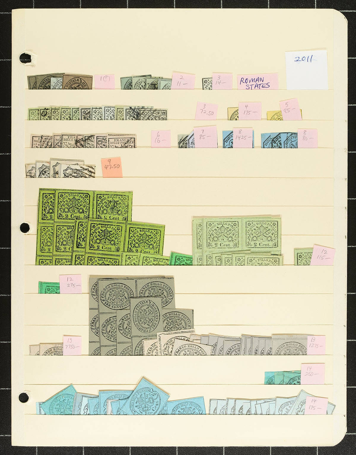 Some of the "early" issues from 1852 are the real thing, much of the "later" issues from 1867-1868 are reprints or forgeries. Housed on three manila stockpages, this is one collector’s accumulation of these early issues and await the curious or the researcher looking for a "stash" from a range of different sources. Identified by Scott numbers and (older) catalogue values. There could be $1000.00 catalogue value of legitimate issues and a hundred thousand dollars of catalogue value of dubious material. We see this type of material in bits and pieces, but rarely in this quantity or diversity. Estimate =
