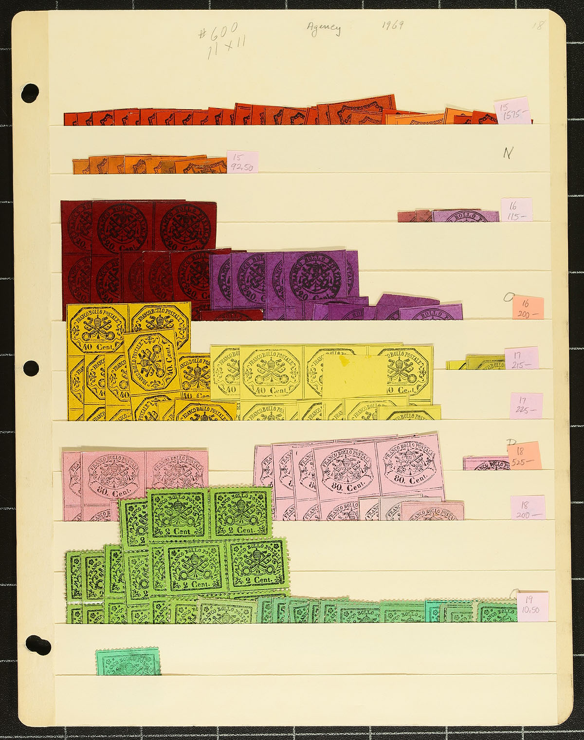 Some of the "early" issues from 1852 are the real thing, much of the "later" issues from 1867-1868 are reprints or forgeries. Housed on three manila stockpages, this is one collector’s accumulation of these early issues and await the curious or the researcher looking for a "stash" from a range of different sources. Identified by Scott numbers and (older) catalogue values. There could be $1000.00 catalogue value of legitimate issues and a hundred thousand dollars of catalogue value of dubious material. We see this type of material in bits and pieces, but rarely in this quantity or diversity. Estimate =