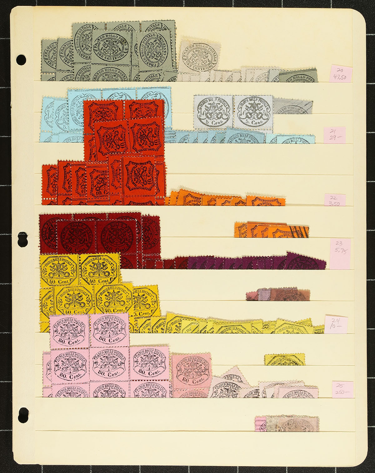 Some of the "early" issues from 1852 are the real thing, much of the "later" issues from 1867-1868 are reprints or forgeries. Housed on three manila stockpages, this is one collector’s accumulation of these early issues and await the curious or the researcher looking for a "stash" from a range of different sources. Identified by Scott numbers and (older) catalogue values. There could be $1000.00 catalogue value of legitimate issues and a hundred thousand dollars of catalogue value of dubious material. We see this type of material in bits and pieces, but rarely in this quantity or diversity. Estimate =