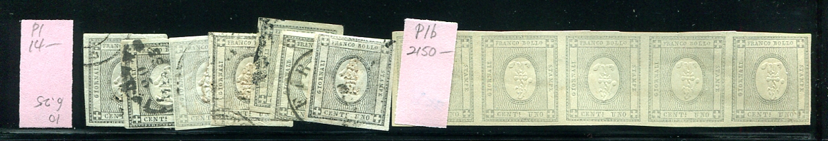 Small mint and used accumulation of King Victor Emanuel II issues of 1855-1863 in quantities of up to a dozen of a type. All counted as basic Scott listed items, but a quick glance shows lots of potential to identify shades and possibly some interesting cancels. Individually priced years ago (these are now high), but the value of this material adds up quickly. There is a nice forgery strip of P1b with the "inverted centre", which was made from remnant stock. Lots of catalogue value here and a good chance to increase your knowledge of this Italian State. Estimate =