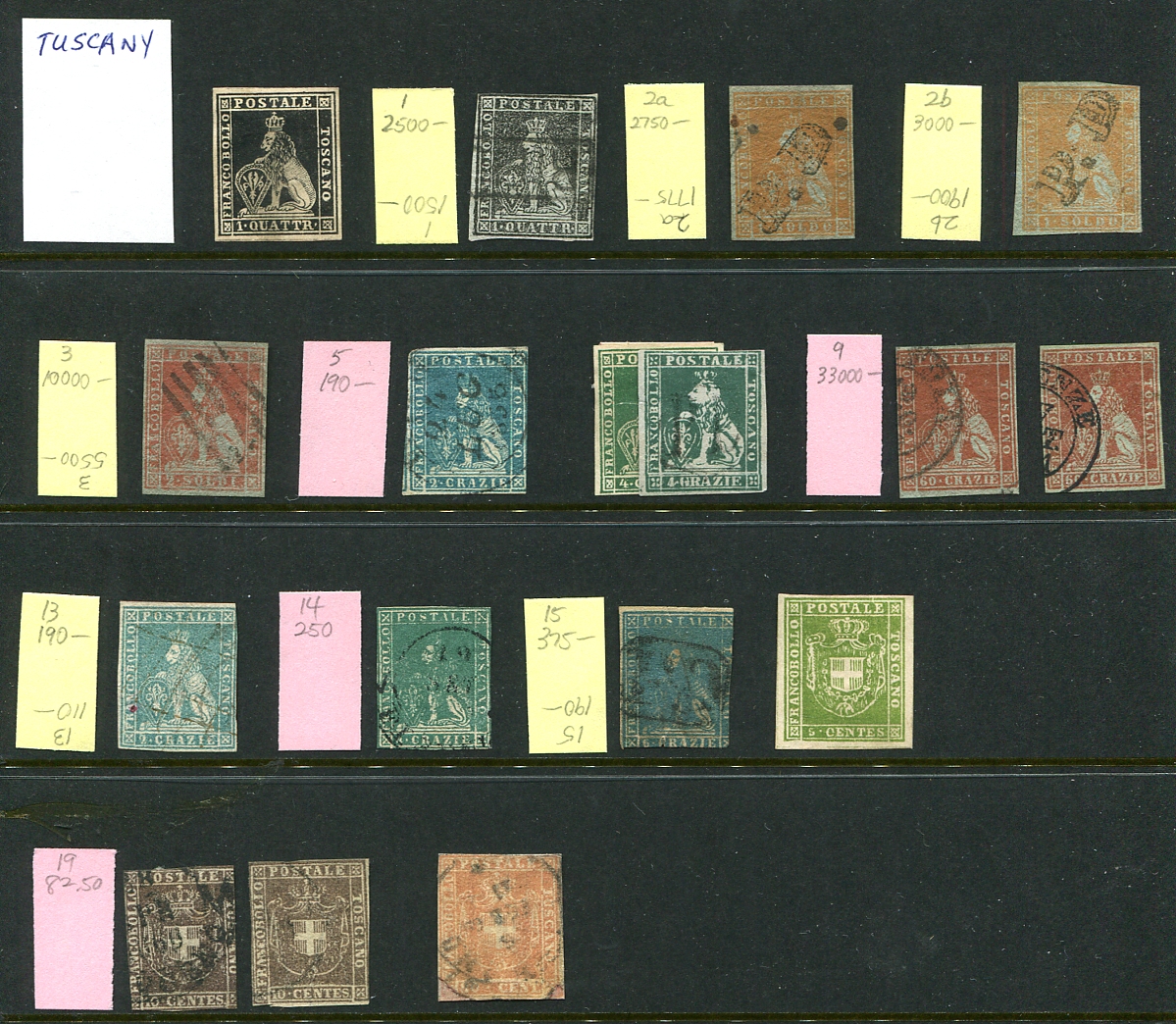 A nice group of 17 "Lion" and "Coat of Arms" designs from 1851-1860, most of which are undoubtedly forgeries, but what a high quality group of forgeries they are. Great to learn how to separate the "wheat" from the "chaff". Individual stamps with catalogue values to $27,500! Fascinating. Estimated at less than $10.00 each. Estimate =