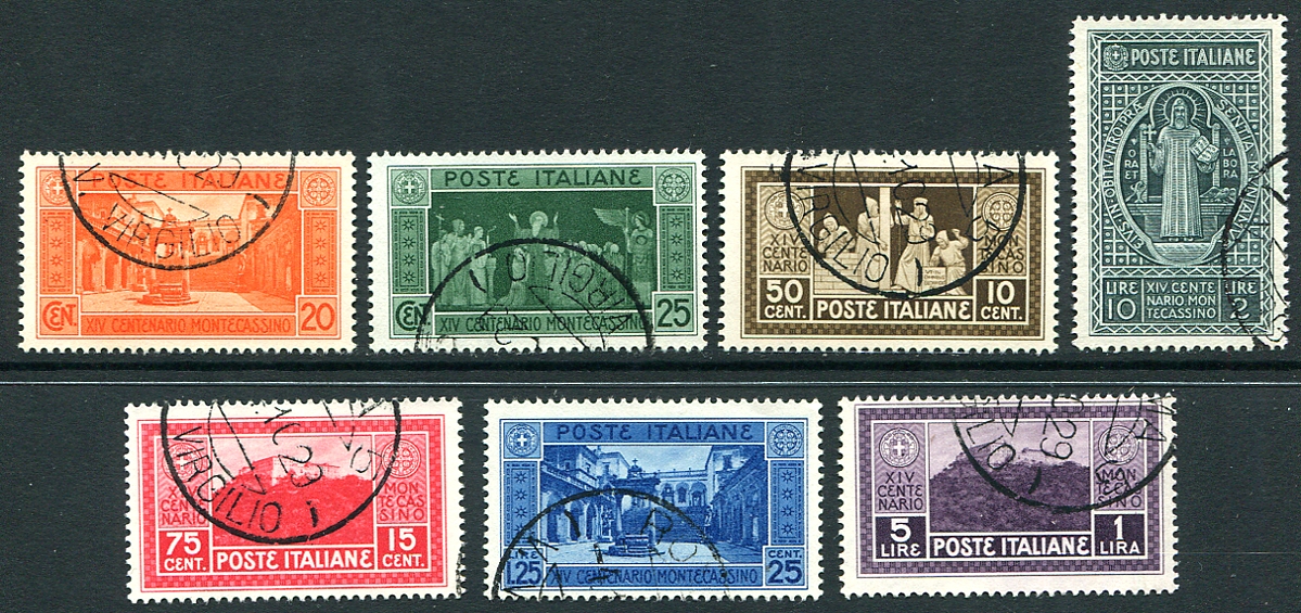 Complete used set of seven for the 14th century anniversary of the founding of the Abbey of Monte Cassino by St. Benedict, issued in 1929. A group with clean circular date stamp cancels. 2024 Scott US$618.20 =