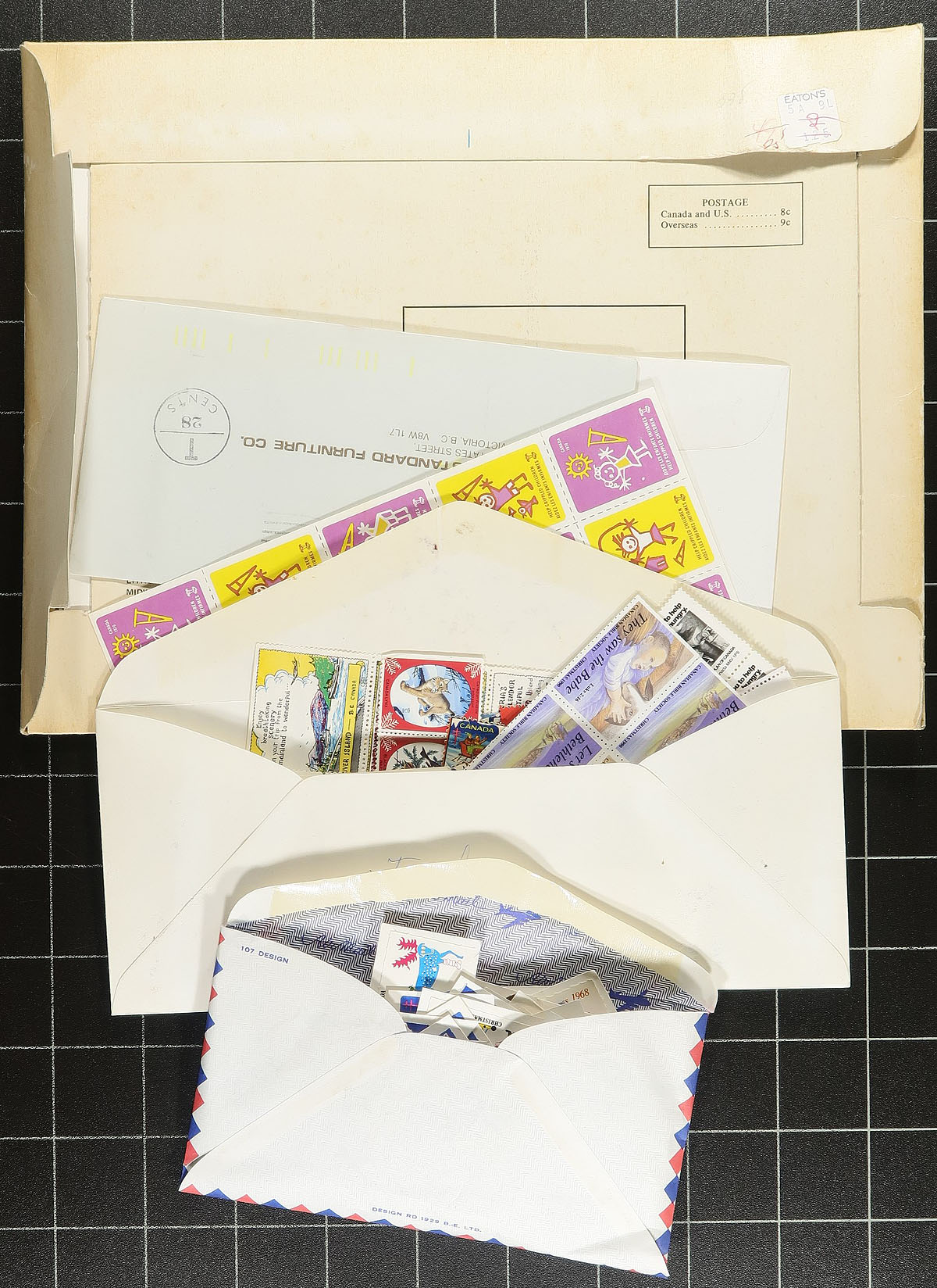 Cinderellas, poster stamps, labels, forgeries, charity, even a bit of ephemera and (GB) perfins. Strength in Canada (group of mint 1980’s-1990’s wildlife stamps, plus three used Alberta licences and a couple of mint panes from Quebec, Royal Hudson sheetlets), United States (nice WWII labels and some post-war fundraising labels), Great Britain (Coronation, Lundy), Europe (WWII Polish labels, forgeries). There is an envelope of "etiquettes" for airmail, special delivery and registration labels. Plus more! Mostly 20th century material, filling an envelope box. Estimate =