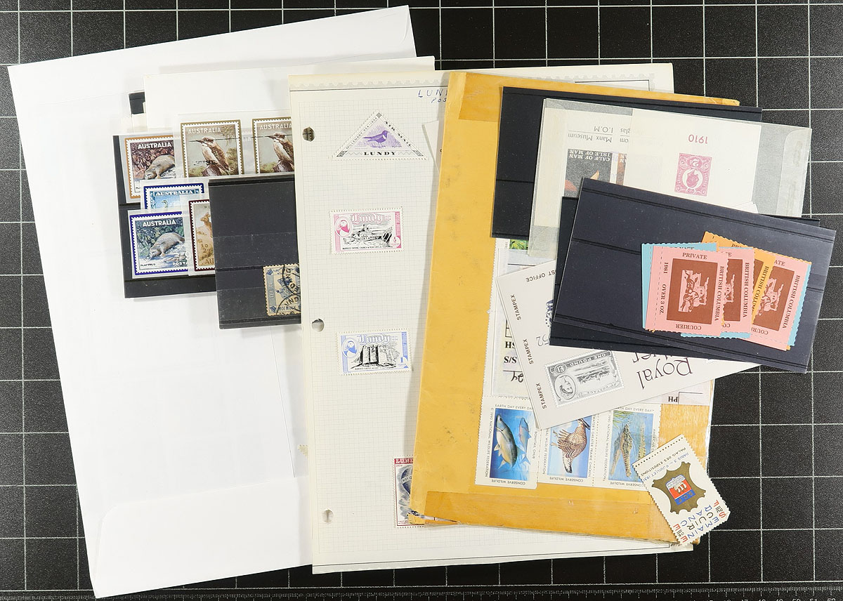 Cinderellas, poster stamps, labels, forgeries, charity, even a bit of ephemera and (GB) perfins. Strength in Canada (group of mint 1980’s-1990’s wildlife stamps, plus three used Alberta licences and a couple of mint panes from Quebec, Royal Hudson sheetlets), United States (nice WWII labels and some post-war fundraising labels), Great Britain (Coronation, Lundy), Europe (WWII Polish labels, forgeries). There is an envelope of "etiquettes" for airmail, special delivery and registration labels. Plus more! Mostly 20th century material, filling an envelope box. Estimate =
