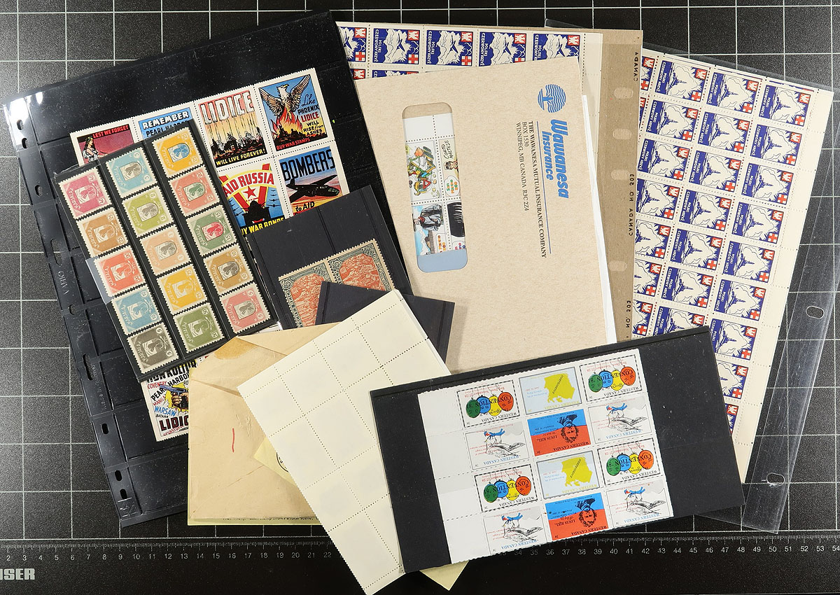 Cinderellas, poster stamps, labels, forgeries, charity, even a bit of ephemera and (GB) perfins. Strength in Canada (group of mint 1980’s-1990’s wildlife stamps, plus three used Alberta licences and a couple of mint panes from Quebec, Royal Hudson sheetlets), United States (nice WWII labels and some post-war fundraising labels), Great Britain (Coronation, Lundy), Europe (WWII Polish labels, forgeries). There is an envelope of "etiquettes" for airmail, special delivery and registration labels. Plus more! Mostly 20th century material, filling an envelope box. Estimate =