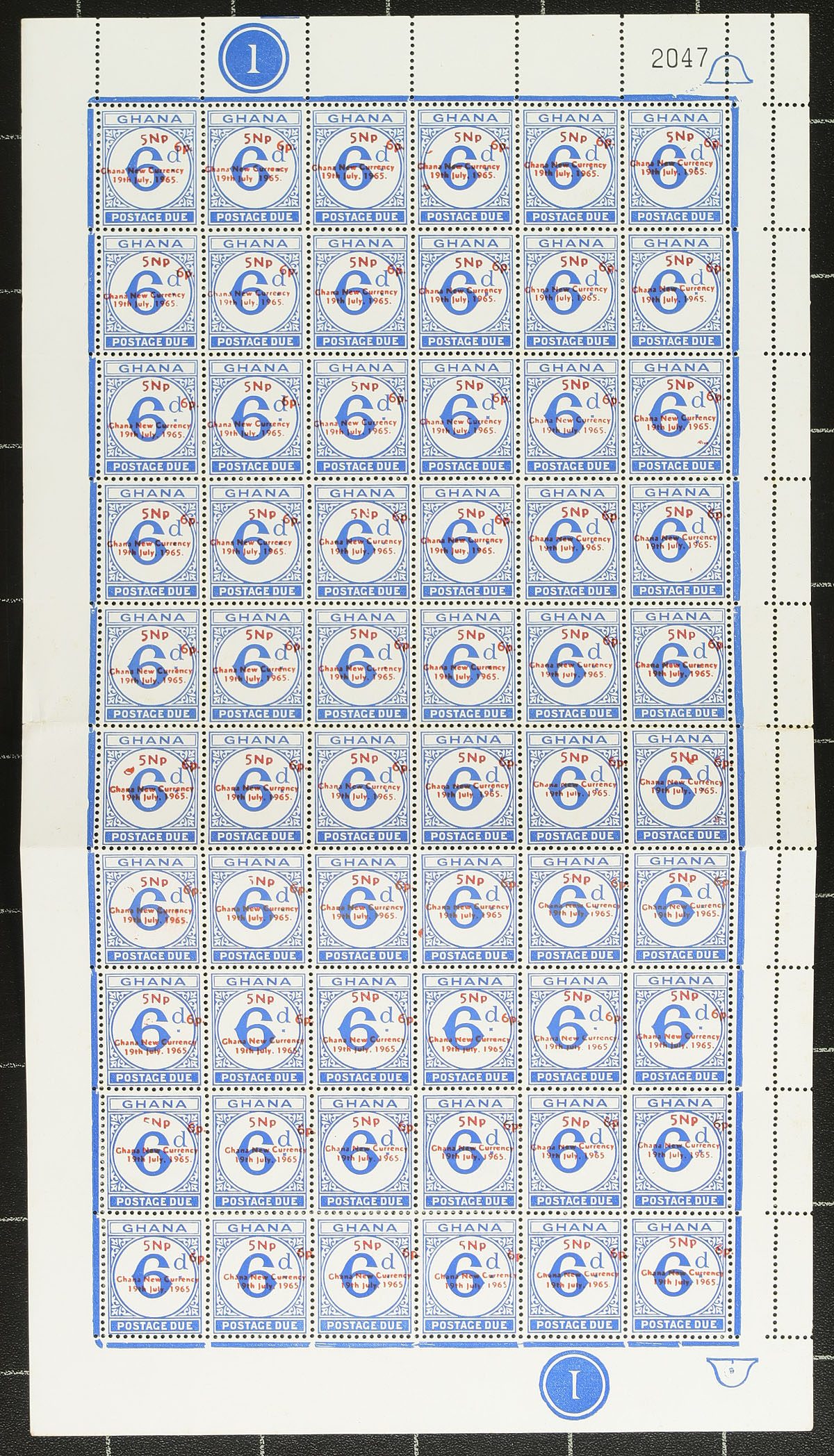 The currency of Ghana changed for the second time in quick succession, and postage due stamps of 1958 had been revalued in 1965 and then revalued again in 1968. However, confusion that might have been caused by a stamp with three separate currencies caused the issue to be scrapped, but three denominations were released at a single post office, before they were pulled. These are complete mint, never hinged, panes of 72 stamps of all three denominations with a sheet and cylinder number. The selvedge has a bit of minor damage and there is some offset on the back from the overprinting process "for the record". Mentioned in a footnote in Scott, but listed in Stanley Gibbons. Owner’s older 2018 Gibbons £756.00 =