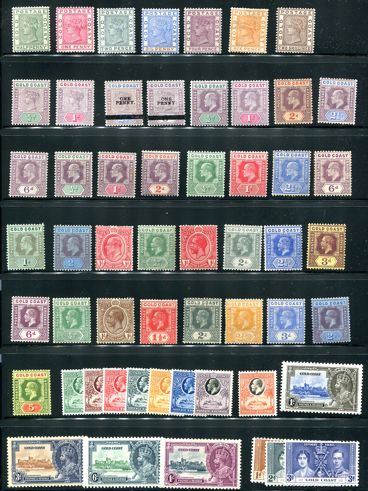 A clean and attractive page of mint Gold Coast from Queen Victoria until the 1937 Coronation issue. Includes a number of better singles such as #14, #20, #40, #93. All are hinged, but a number very lightly. A nice fresh grouping from this British Africa colony before it became Ghana after independence. 2024 Scott US$600.30 =