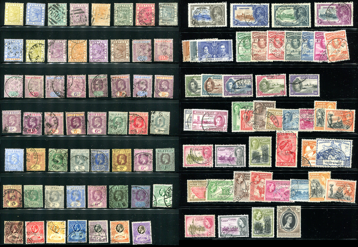 A couple of pages of pre-Ghana colonial era with a nice mix of better and common material, with lots of nice cancels noted. Better singles include #4 (possibly mint, no gum), #22, #23, the 1935 Silver Jubilee set and most of the two King George VI and the first QEII "Pictorial" sets (just missing a couple of common items). Great appearance and very few faults noted. 2024 Scott US$568.10 =